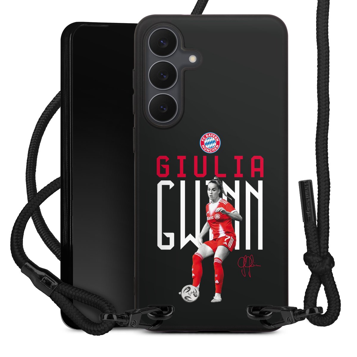 The matt black silicone case is made of flexible TPU (thermoplastic polyurethane) and offers robust protection. The durable, unbreakable material makes the cover flexible and dimensionally stable at the same time. The matte surface makes your design stand out more and is less susceptible to fingerprints and dirt. The stylish trend accessory fits comfortably in the hand and is perfectly complemented by the fabric (polyester) mobile phone strap. The braided fabric strap is approx. 1.70 metres long with a diameter of approx. 0.5 cm. Due to the special knotting technique, the length of the strap can be adjusted by simply pulling it, so that you can adapt it individually to your wishes. The practical case to wear around your neck is available with the fabric strap in black. As a little icing on the cake, we have provided the strap with a chic metal fastener in matt black. The strap is securely fastened to the case with loops made of high-quality genuine leather and press studs. The ends of the fabric strap are covered with metallic end caps and thus protected from fraying.