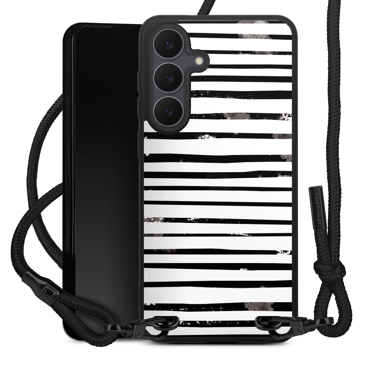 The matt black silicone case is made of flexible TPU (thermoplastic polyurethane) and offers robust protection. The durable, unbreakable material makes the cover flexible and dimensionally stable at the same time. The matte surface makes your design stand out more and is less susceptible to fingerprints and dirt. The stylish trend accessory fits comfortably in the hand and is perfectly complemented by the fabric (polyester) mobile phone strap. The braided fabric strap is approx. 1.70 metres long with a diameter of approx. 0.5 cm. Due to the special knotting technique, the length of the strap can be adjusted by simply pulling it, so that you can adapt it individually to your wishes. The practical case to wear around your neck is available with the fabric strap in black. As a little icing on the cake, we have provided the strap with a chic metal fastener in matt black. The strap is securely fastened to the case with loops made of high-quality genuine leather and press studs. The ends of the fabric strap are covered with metallic end caps and thus protected from fraying.