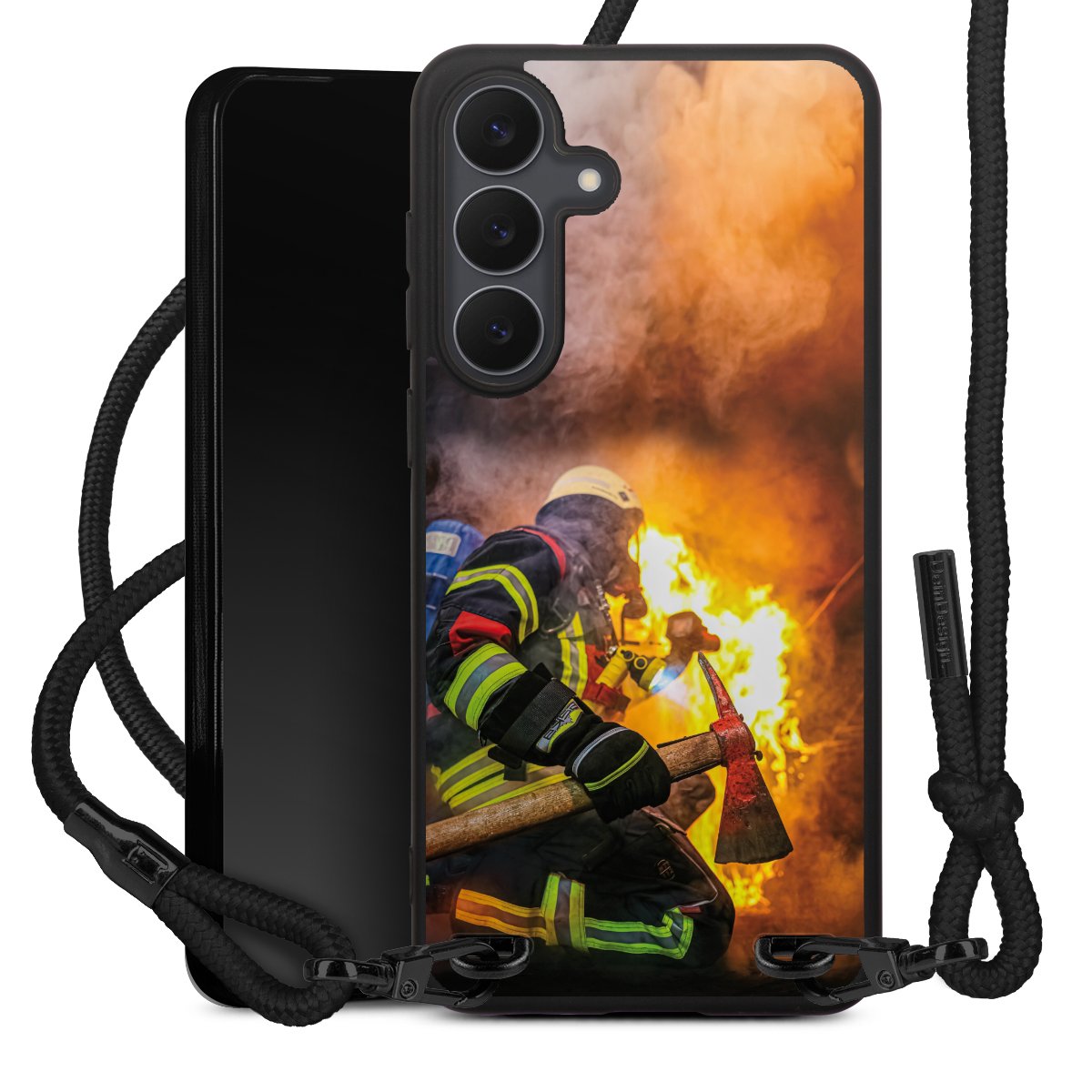 The matt black silicone case is made of flexible TPU (thermoplastic polyurethane) and offers robust protection. The durable, unbreakable material makes the cover flexible and dimensionally stable at the same time. The matte surface makes your design stand out more and is less susceptible to fingerprints and dirt. The stylish trend accessory fits comfortably in the hand and is perfectly complemented by the fabric (polyester) mobile phone strap. The braided fabric strap is approx. 1.70 metres long with a diameter of approx. 0.5 cm. Due to the special knotting technique, the length of the strap can be adjusted by simply pulling it, so that you can adapt it individually to your wishes. The practical case to wear around your neck is available with the fabric strap in black. As a little icing on the cake, we have provided the strap with a chic metal fastener in matt black. The strap is securely fastened to the case with loops made of high-quality genuine leather and press studs. The ends of the fabric strap are covered with metallic end caps and thus protected from fraying.