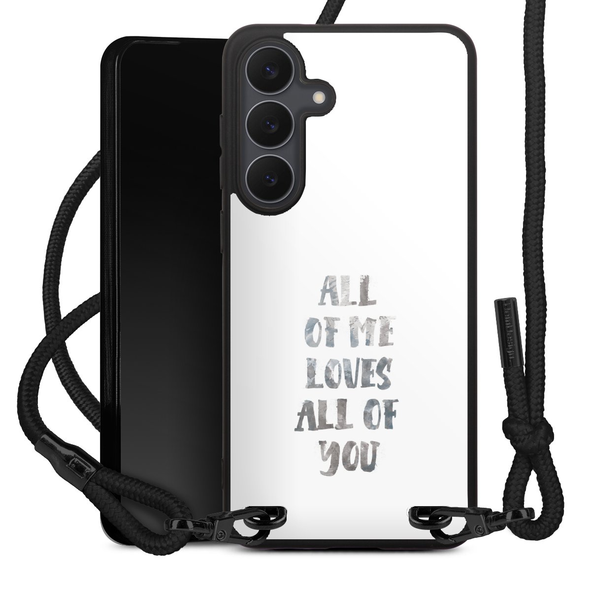 The matt black silicone case is made of flexible TPU (thermoplastic polyurethane) and offers robust protection. The durable, unbreakable material makes the cover flexible and dimensionally stable at the same time. The matte surface makes your design stand out more and is less susceptible to fingerprints and dirt. The stylish trend accessory fits comfortably in the hand and is perfectly complemented by the fabric (polyester) mobile phone strap. The braided fabric strap is approx. 1.70 metres long with a diameter of approx. 0.5 cm. Due to the special knotting technique, the length of the strap can be adjusted by simply pulling it, so that you can adapt it individually to your wishes. The practical case to wear around your neck is available with the fabric strap in black. As a little icing on the cake, we have provided the strap with a chic metal fastener in matt black. The strap is securely fastened to the case with loops made of high-quality genuine leather and press studs. The ends of the fabric strap are covered with metallic end caps and thus protected from fraying.