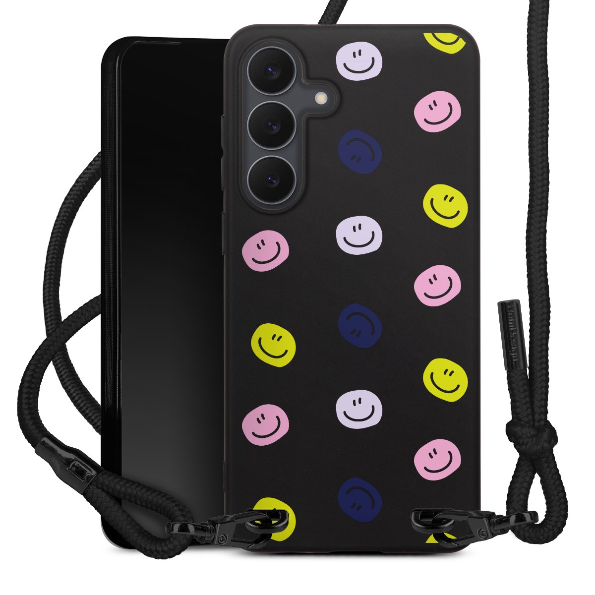 The matt black silicone case is made of flexible TPU (thermoplastic polyurethane) and offers robust protection. The durable, unbreakable material makes the cover flexible and dimensionally stable at the same time. The matte surface makes your design stand out more and is less susceptible to fingerprints and dirt. The stylish trend accessory fits comfortably in the hand and is perfectly complemented by the fabric (polyester) mobile phone strap. The braided fabric strap is approx. 1.70 metres long with a diameter of approx. 0.5 cm. Due to the special knotting technique, the length of the strap can be adjusted by simply pulling it, so that you can adapt it individually to your wishes. The practical case to wear around your neck is available with the fabric strap in black. As a little icing on the cake, we have provided the strap with a chic metal fastener in matt black. The strap is securely fastened to the case with loops made of high-quality genuine leather and press studs. The ends of the fabric strap are covered with metallic end caps and thus protected from fraying.