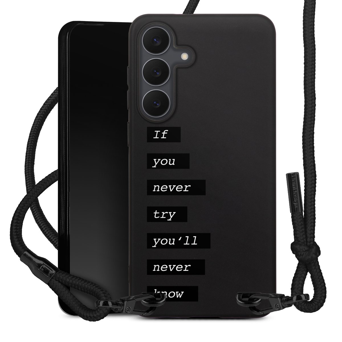 The matt black silicone case is made of flexible TPU (thermoplastic polyurethane) and offers robust protection. The durable, unbreakable material makes the cover flexible and dimensionally stable at the same time. The matte surface makes your design stand out more and is less susceptible to fingerprints and dirt. The stylish trend accessory fits comfortably in the hand and is perfectly complemented by the fabric (polyester) mobile phone strap. The braided fabric strap is approx. 1.70 metres long with a diameter of approx. 0.5 cm. Due to the special knotting technique, the length of the strap can be adjusted by simply pulling it, so that you can adapt it individually to your wishes. The practical case to wear around your neck is available with the fabric strap in black. As a little icing on the cake, we have provided the strap with a chic metal fastener in matt black. The strap is securely fastened to the case with loops made of high-quality genuine leather and press studs. The ends of the fabric strap are covered with metallic end caps and thus protected from fraying.