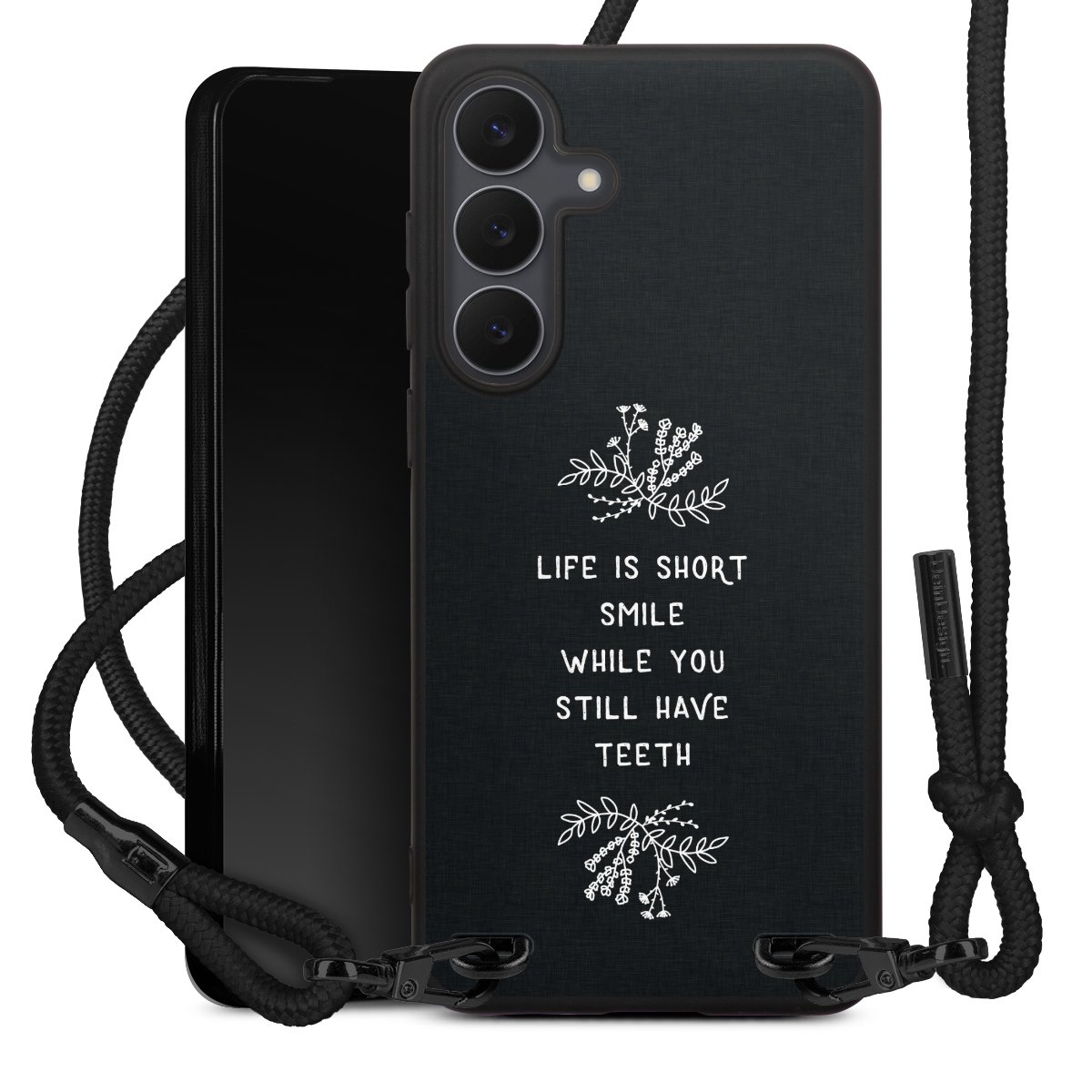 The matt black silicone case is made of flexible TPU (thermoplastic polyurethane) and offers robust protection. The durable, unbreakable material makes the cover flexible and dimensionally stable at the same time. The matte surface makes your design stand out more and is less susceptible to fingerprints and dirt. The stylish trend accessory fits comfortably in the hand and is perfectly complemented by the fabric (polyester) mobile phone strap. The braided fabric strap is approx. 1.70 metres long with a diameter of approx. 0.5 cm. Due to the special knotting technique, the length of the strap can be adjusted by simply pulling it, so that you can adapt it individually to your wishes. The practical case to wear around your neck is available with the fabric strap in black. As a little icing on the cake, we have provided the strap with a chic metal fastener in matt black. The strap is securely fastened to the case with loops made of high-quality genuine leather and press studs. The ends of the fabric strap are covered with metallic end caps and thus protected from fraying.