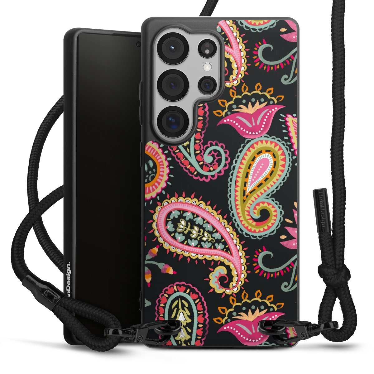 The matt black silicone case is made of flexible TPU (thermoplastic polyurethane) and offers robust protection. The durable, unbreakable material makes the cover flexible and dimensionally stable at the same time. The matte surface makes your design stand out more and is less susceptible to fingerprints and dirt. The stylish trend accessory fits comfortably in the hand and is perfectly complemented by the fabric (polyester) mobile phone strap. The braided fabric strap is approx. 1.70 metres long with a diameter of approx. 0.5 cm. Due to the special knotting technique, the length of the strap can be adjusted by simply pulling it, so that you can adapt it individually to your wishes. The practical case to wear around your neck is available with the fabric strap in black. As a little icing on the cake, we have provided the strap with a chic metal fastener in matt black. The strap is securely fastened to the case with loops made of high-quality genuine leather and press studs. The ends of the fabric strap are covered with metallic end caps and thus protected from fraying.