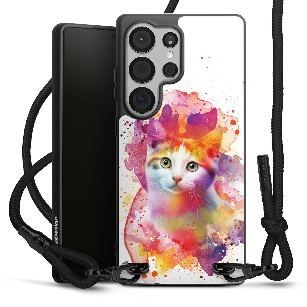 The matt black silicone case is made of flexible TPU (thermoplastic polyurethane) and offers robust protection. The durable, unbreakable material makes the cover flexible and dimensionally stable at the same time. The matte surface makes your design stand out more and is less susceptible to fingerprints and dirt. The stylish trend accessory fits comfortably in the hand and is perfectly complemented by the fabric (polyester) mobile phone strap. The braided fabric strap is approx. 1.70 metres long with a diameter of approx. 0.5 cm. Due to the special knotting technique, the length of the strap can be adjusted by simply pulling it, so that you can adapt it individually to your wishes. The practical case to wear around your neck is available with the fabric strap in black. As a little icing on the cake, we have provided the strap with a chic metal fastener in matt black. The strap is securely fastened to the case with loops made of high-quality genuine leather and press studs. The ends of the fabric strap are covered with metallic end caps and thus protected from fraying.