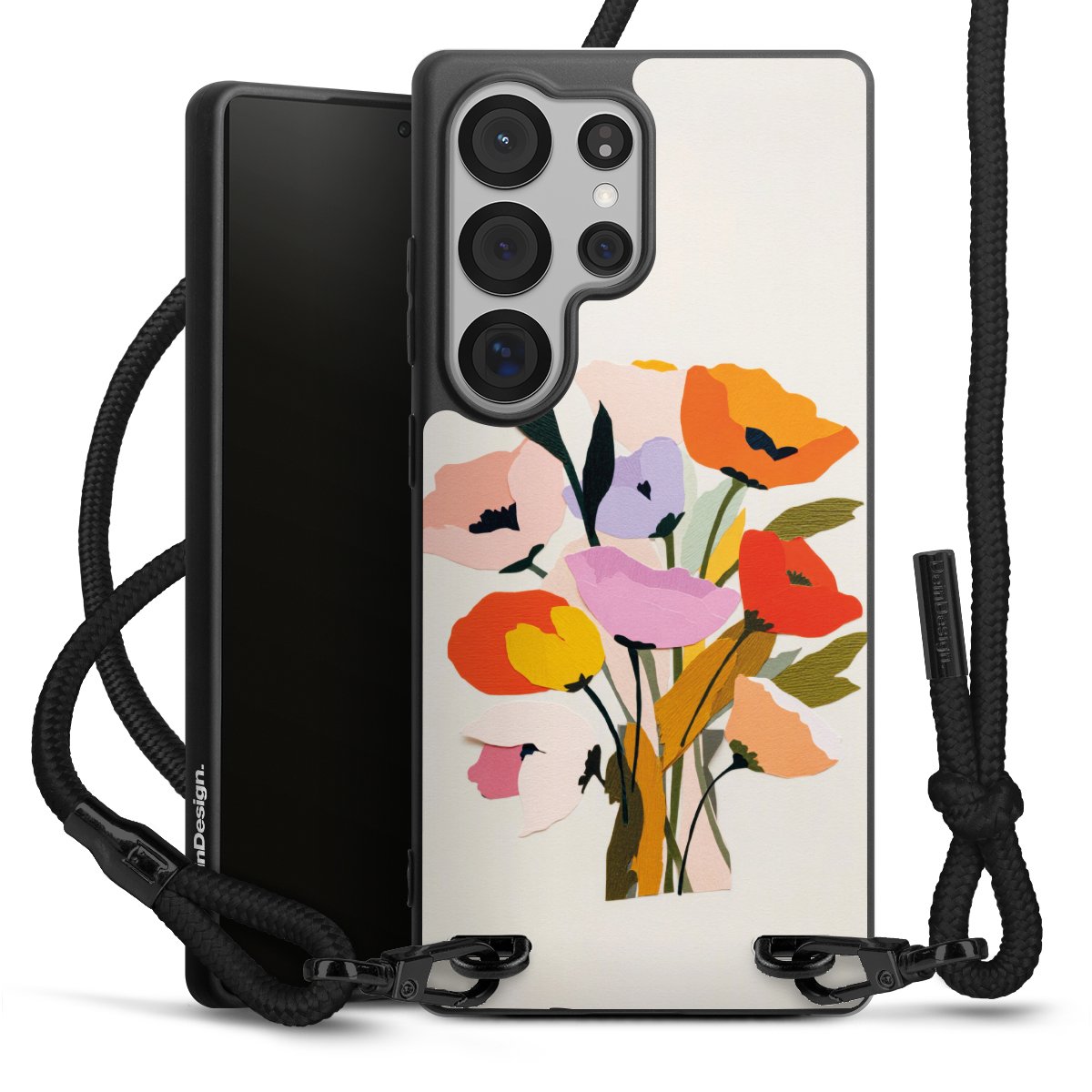 The matt black silicone case is made of flexible TPU (thermoplastic polyurethane) and offers robust protection. The durable, unbreakable material makes the cover flexible and dimensionally stable at the same time. The matte surface makes your design stand out more and is less susceptible to fingerprints and dirt. The stylish trend accessory fits comfortably in the hand and is perfectly complemented by the fabric (polyester) mobile phone strap. The braided fabric strap is approx. 1.70 metres long with a diameter of approx. 0.5 cm. Due to the special knotting technique, the length of the strap can be adjusted by simply pulling it, so that you can adapt it individually to your wishes. The practical case to wear around your neck is available with the fabric strap in black. As a little icing on the cake, we have provided the strap with a chic metal fastener in matt black. The strap is securely fastened to the case with loops made of high-quality genuine leather and press studs. The ends of the fabric strap are covered with metallic end caps and thus protected from fraying.