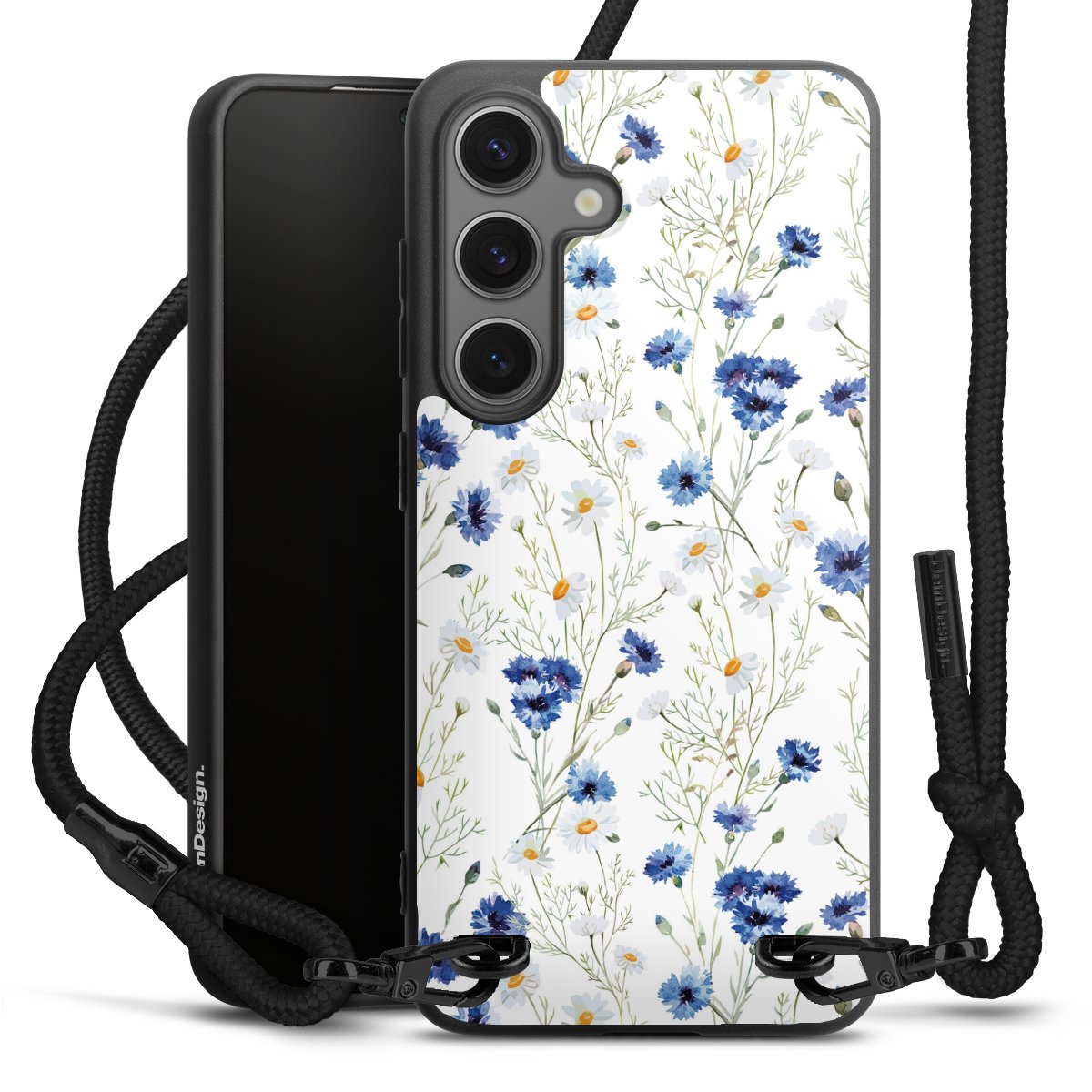 The matt black silicone case is made of flexible TPU (thermoplastic polyurethane) and offers robust protection. The durable, unbreakable material makes the cover flexible and dimensionally stable at the same time. The matte surface makes your design stand out more and is less susceptible to fingerprints and dirt. The stylish trend accessory fits comfortably in the hand and is perfectly complemented by the fabric (polyester) mobile phone strap. The braided fabric strap is approx. 1.70 metres long with a diameter of approx. 0.5 cm. Due to the special knotting technique, the length of the strap can be adjusted by simply pulling it, so that you can adapt it individually to your wishes. The practical case to wear around your neck is available with the fabric strap in black. As a little icing on the cake, we have provided the strap with a chic metal fastener in matt black. The strap is securely fastened to the case with loops made of high-quality genuine leather and press studs. The ends of the fabric strap are covered with metallic end caps and thus protected from fraying.