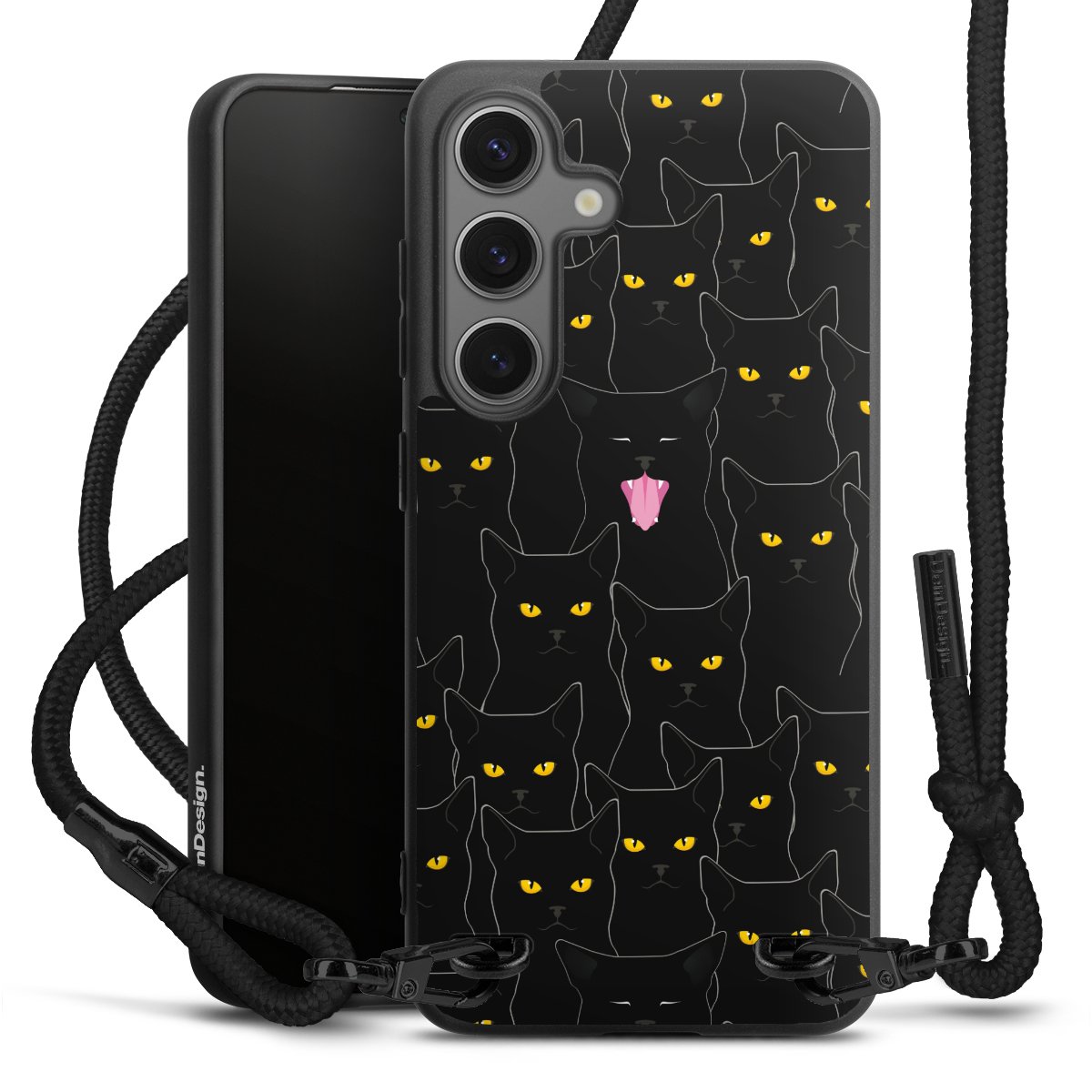 The matt black silicone case is made of flexible TPU (thermoplastic polyurethane) and offers robust protection. The durable, unbreakable material makes the cover flexible and dimensionally stable at the same time. The matte surface makes your design stand out more and is less susceptible to fingerprints and dirt. The stylish trend accessory fits comfortably in the hand and is perfectly complemented by the fabric (polyester) mobile phone strap. The braided fabric strap is approx. 1.70 metres long with a diameter of approx. 0.5 cm. Due to the special knotting technique, the length of the strap can be adjusted by simply pulling it, so that you can adapt it individually to your wishes. The practical case to wear around your neck is available with the fabric strap in black. As a little icing on the cake, we have provided the strap with a chic metal fastener in matt black. The strap is securely fastened to the case with loops made of high-quality genuine leather and press studs. The ends of the fabric strap are covered with metallic end caps and thus protected from fraying.