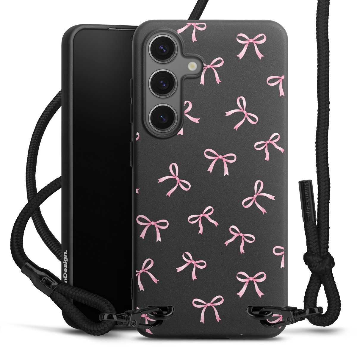 The matt black silicone case is made of flexible TPU (thermoplastic polyurethane) and offers robust protection. The durable, unbreakable material makes the cover flexible and dimensionally stable at the same time. The matte surface makes your design stand out more and is less susceptible to fingerprints and dirt. The stylish trend accessory fits comfortably in the hand and is perfectly complemented by the fabric (polyester) mobile phone strap. The braided fabric strap is approx. 1.70 metres long with a diameter of approx. 0.5 cm. Due to the special knotting technique, the length of the strap can be adjusted by simply pulling it, so that you can adapt it individually to your wishes. The practical case to wear around your neck is available with the fabric strap in black. As a little icing on the cake, we have provided the strap with a chic metal fastener in matt black. The strap is securely fastened to the case with loops made of high-quality genuine leather and press studs. The ends of the fabric strap are covered with metallic end caps and thus protected from fraying.