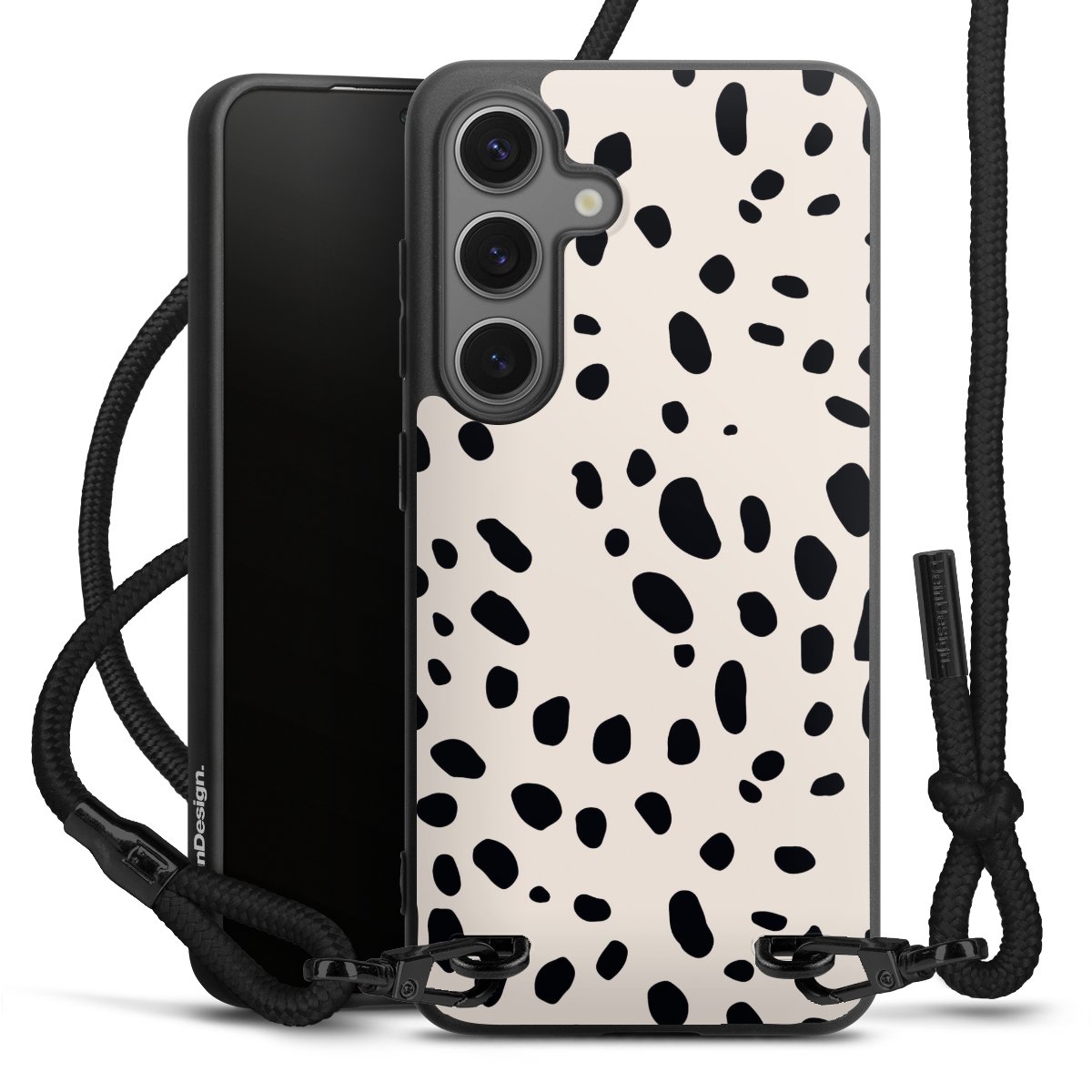 The matt black silicone case is made of flexible TPU (thermoplastic polyurethane) and offers robust protection. The durable, unbreakable material makes the cover flexible and dimensionally stable at the same time. The matte surface makes your design stand out more and is less susceptible to fingerprints and dirt. The stylish trend accessory fits comfortably in the hand and is perfectly complemented by the fabric (polyester) mobile phone strap. The braided fabric strap is approx. 1.70 metres long with a diameter of approx. 0.5 cm. Due to the special knotting technique, the length of the strap can be adjusted by simply pulling it, so that you can adapt it individually to your wishes. The practical case to wear around your neck is available with the fabric strap in black. As a little icing on the cake, we have provided the strap with a chic metal fastener in matt black. The strap is securely fastened to the case with loops made of high-quality genuine leather and press studs. The ends of the fabric strap are covered with metallic end caps and thus protected from fraying.