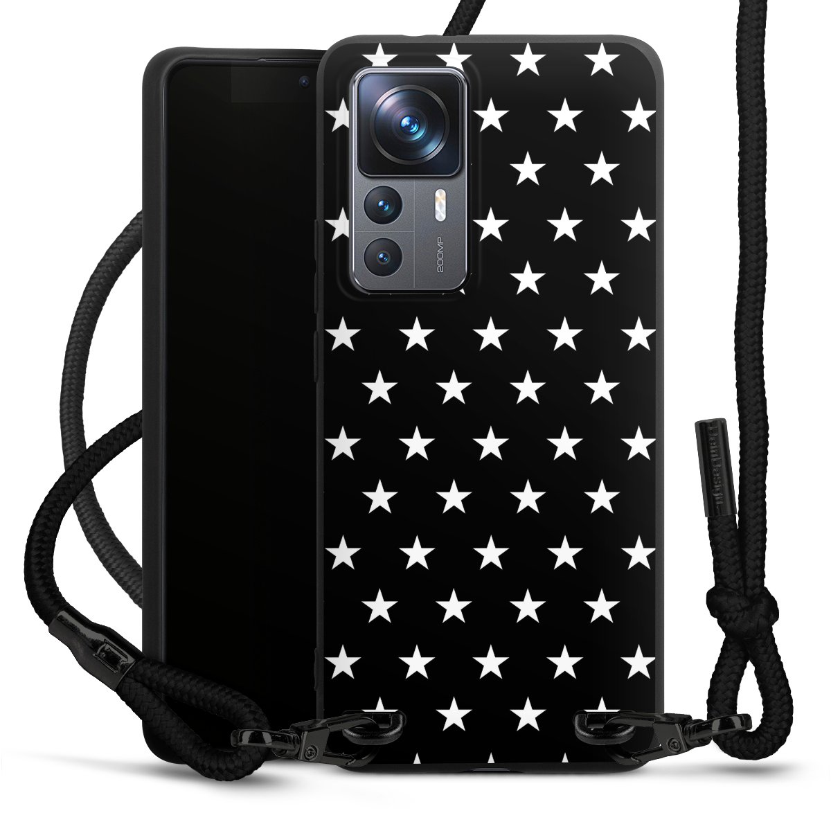 The matt black silicone case is made of flexible TPU (thermoplastic polyurethane) and offers robust protection. The durable, unbreakable material makes the cover flexible and dimensionally stable at the same time. The matte surface makes your design stand out more and is less susceptible to fingerprints and dirt. The stylish trend accessory fits comfortably in the hand and is perfectly complemented by the fabric (polyester) mobile phone strap. The braided fabric strap is approx. 1.70 metres long with a diameter of approx. 0.5 cm. Due to the special knotting technique, the length of the strap can be adjusted by simply pulling it, so that you can adapt it individually to your wishes. The practical case to wear around your neck is available with the fabric strap in black. As a little icing on the cake, we have provided the strap with a chic metal fastener in matt black. The strap is securely fastened to the case with loops made of high-quality genuine leather and press studs. The ends of the fabric strap are covered with metallic end caps and thus protected from fraying.