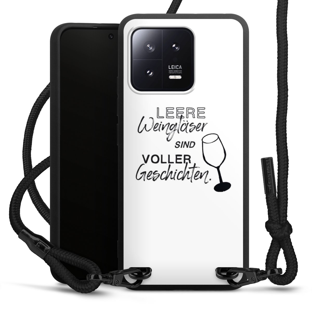 The matt black silicone case is made of flexible TPU (thermoplastic polyurethane) and offers robust protection. The durable, unbreakable material makes the cover flexible and dimensionally stable at the same time. The matte surface makes your design stand out more and is less susceptible to fingerprints and dirt. The stylish trend accessory fits comfortably in the hand and is perfectly complemented by the fabric (polyester) mobile phone strap. The braided fabric strap is approx. 1.70 metres long with a diameter of approx. 0.5 cm. Due to the special knotting technique, the length of the strap can be adjusted by simply pulling it, so that you can adapt it individually to your wishes. The practical case to wear around your neck is available with the fabric strap in black. As a little icing on the cake, we have provided the strap with a chic metal fastener in matt black. The strap is securely fastened to the case with loops made of high-quality genuine leather and press studs. The ends of the fabric strap are covered with metallic end caps and thus protected from fraying.