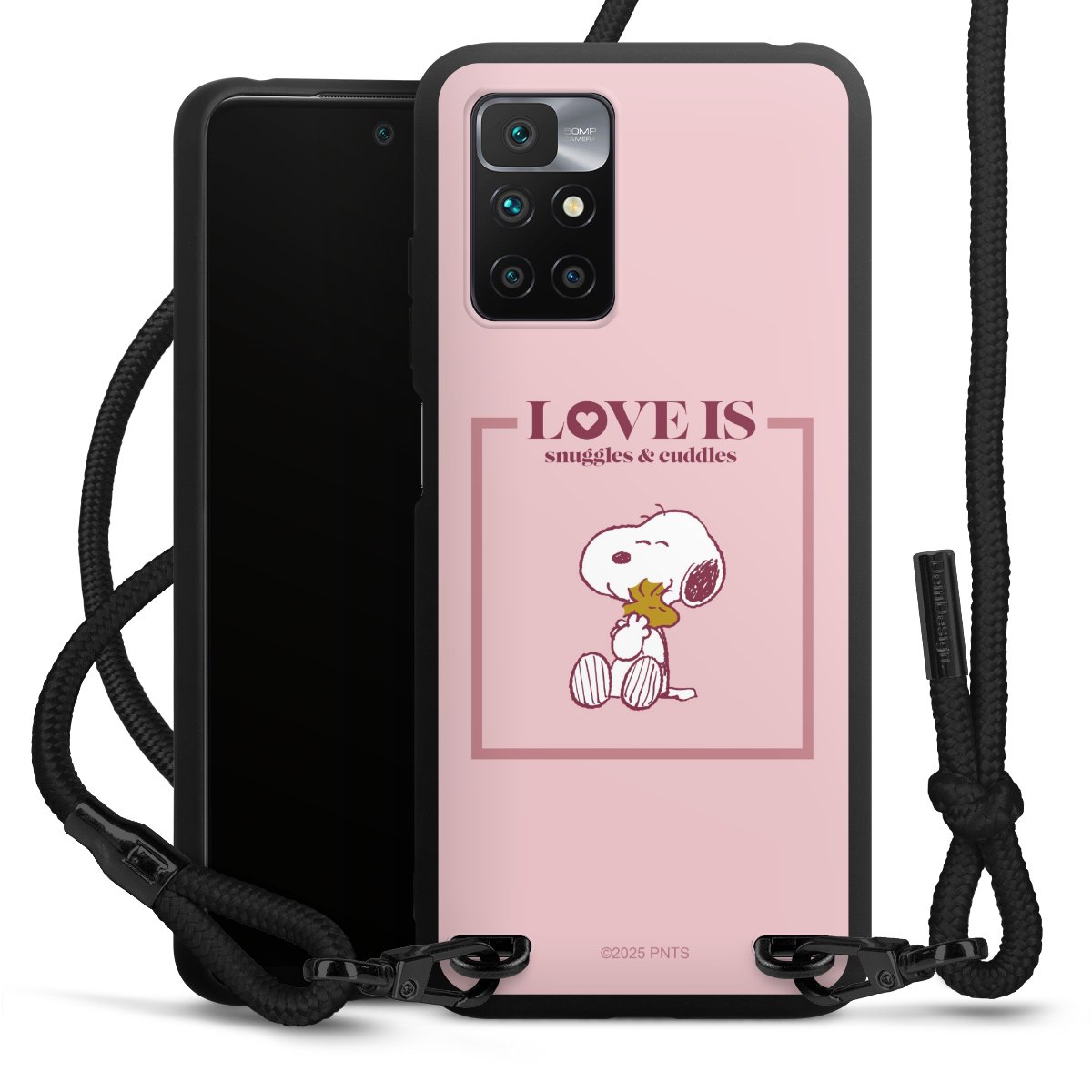 The matt black silicone case is made of flexible TPU (thermoplastic polyurethane) and offers robust protection. The durable, unbreakable material makes the cover flexible and dimensionally stable at the same time. The matte surface makes your design stand out more and is less susceptible to fingerprints and dirt. The stylish trend accessory fits comfortably in the hand and is perfectly complemented by the fabric (polyester) mobile phone strap. The braided fabric strap is approx. 1.70 metres long with a diameter of approx. 0.5 cm. Due to the special knotting technique, the length of the strap can be adjusted by simply pulling it, so that you can adapt it individually to your wishes. The practical case to wear around your neck is available with the fabric strap in black. As a little icing on the cake, we have provided the strap with a chic metal fastener in matt black. The strap is securely fastened to the case with loops made of high-quality genuine leather and press studs. The ends of the fabric strap are covered with metallic end caps and thus protected from fraying.
