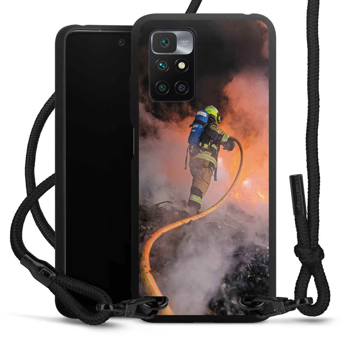 The matt black silicone case is made of flexible TPU (thermoplastic polyurethane) and offers robust protection. The durable, unbreakable material makes the cover flexible and dimensionally stable at the same time. The matte surface makes your design stand out more and is less susceptible to fingerprints and dirt. The stylish trend accessory fits comfortably in the hand and is perfectly complemented by the fabric (polyester) mobile phone strap. The braided fabric strap is approx. 1.70 metres long with a diameter of approx. 0.5 cm. Due to the special knotting technique, the length of the strap can be adjusted by simply pulling it, so that you can adapt it individually to your wishes. The practical case to wear around your neck is available with the fabric strap in black. As a little icing on the cake, we have provided the strap with a chic metal fastener in matt black. The strap is securely fastened to the case with loops made of high-quality genuine leather and press studs. The ends of the fabric strap are covered with metallic end caps and thus protected from fraying.