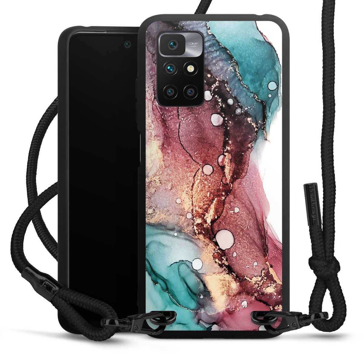 The matt black silicone case is made of flexible TPU (thermoplastic polyurethane) and offers robust protection. The durable, unbreakable material makes the cover flexible and dimensionally stable at the same time. The matte surface makes your design stand out more and is less susceptible to fingerprints and dirt. The stylish trend accessory fits comfortably in the hand and is perfectly complemented by the fabric (polyester) mobile phone strap. The braided fabric strap is approx. 1.70 metres long with a diameter of approx. 0.5 cm. Due to the special knotting technique, the length of the strap can be adjusted by simply pulling it, so that you can adapt it individually to your wishes. The practical case to wear around your neck is available with the fabric strap in black. As a little icing on the cake, we have provided the strap with a chic metal fastener in matt black. The strap is securely fastened to the case with loops made of high-quality genuine leather and press studs. The ends of the fabric strap are covered with metallic end caps and thus protected from fraying.