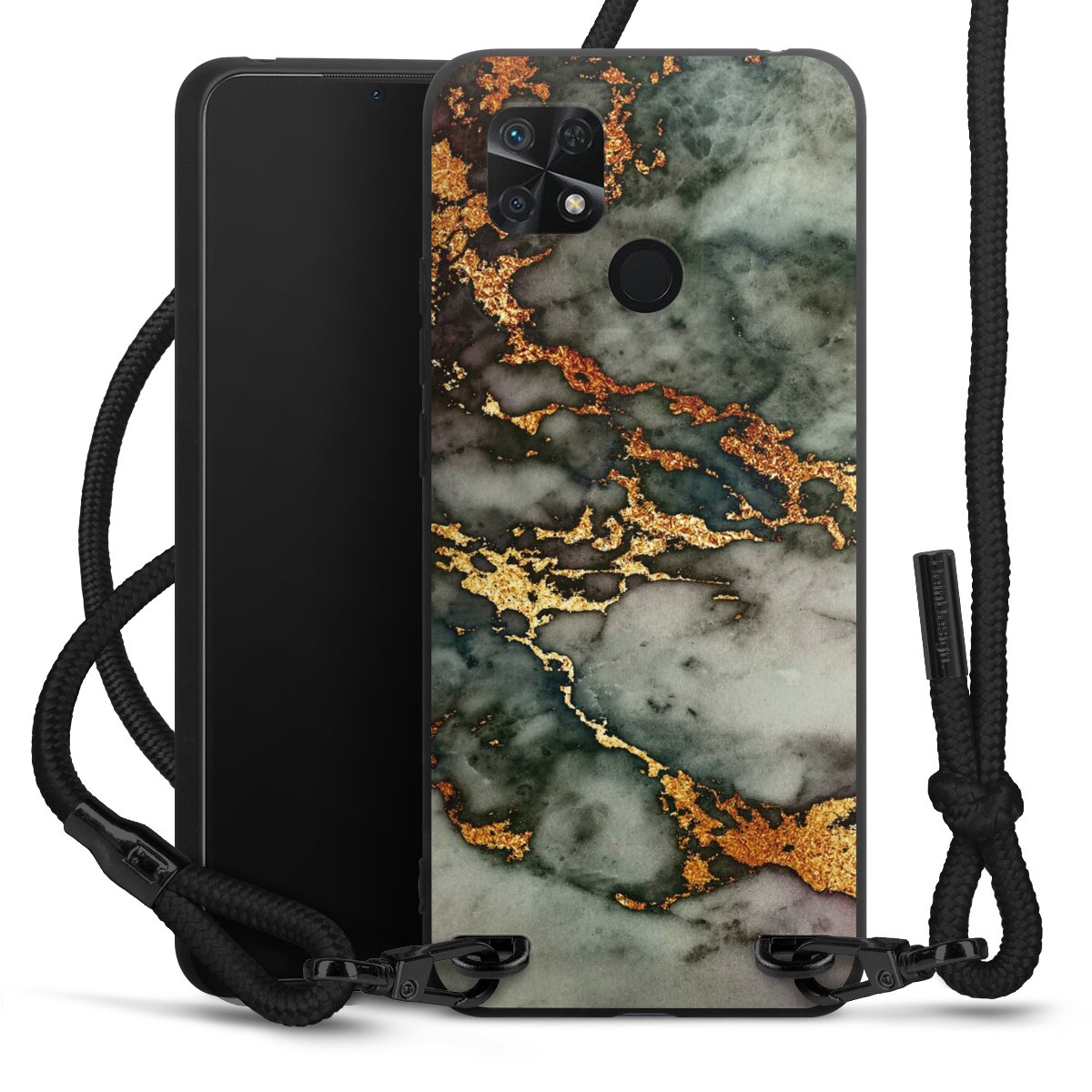The matt black silicone case is made of flexible TPU (thermoplastic polyurethane) and offers robust protection. The durable, unbreakable material makes the cover flexible and dimensionally stable at the same time. The matte surface makes your design stand out more and is less susceptible to fingerprints and dirt. The stylish trend accessory fits comfortably in the hand and is perfectly complemented by the fabric (polyester) mobile phone strap. The braided fabric strap is approx. 1.70 metres long with a diameter of approx. 0.5 cm. Due to the special knotting technique, the length of the strap can be adjusted by simply pulling it, so that you can adapt it individually to your wishes. The practical case to wear around your neck is available with the fabric strap in black. As a little icing on the cake, we have provided the strap with a chic metal fastener in matt black. The strap is securely fastened to the case with loops made of high-quality genuine leather and press studs. The ends of the fabric strap are covered with metallic end caps and thus protected from fraying.