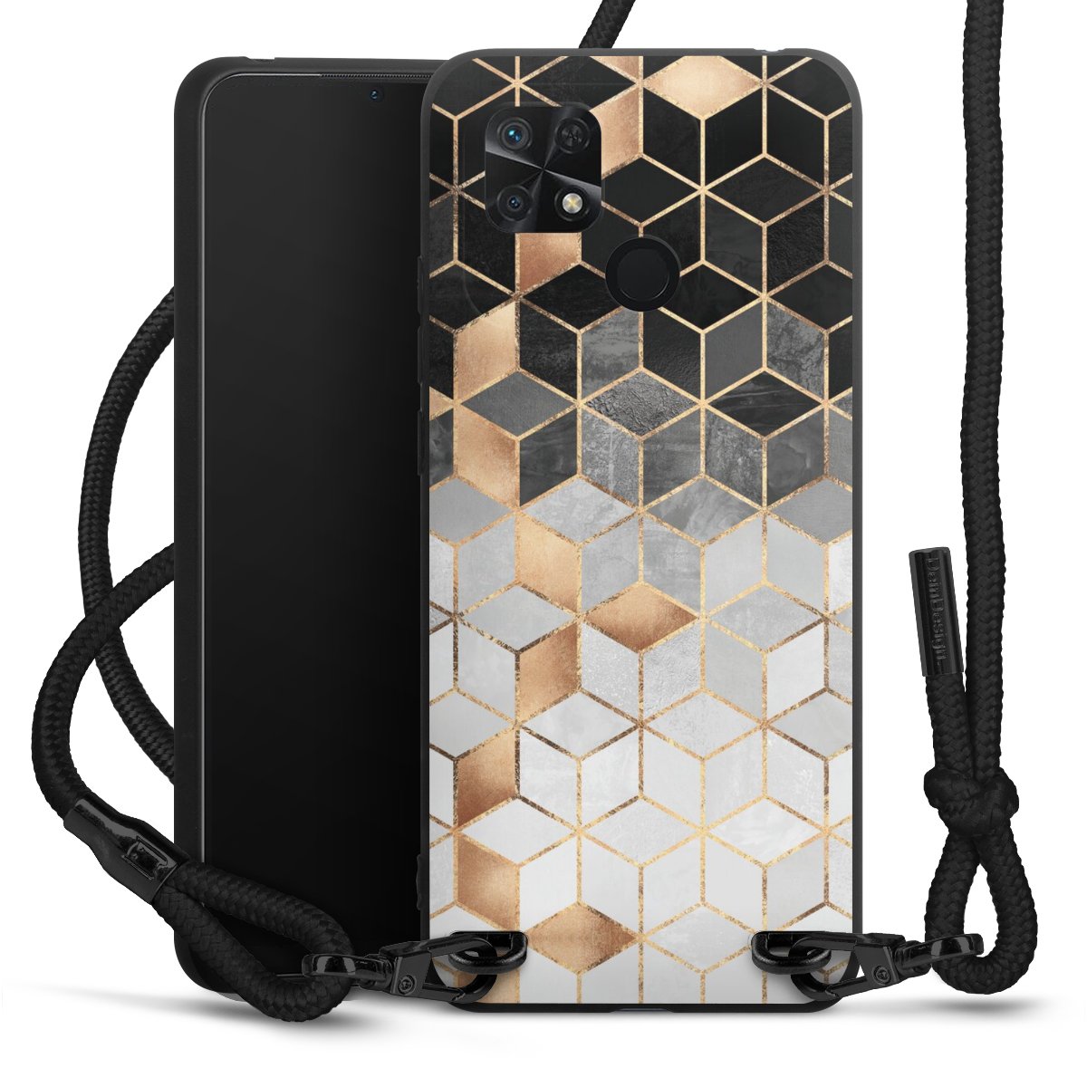 The matt black silicone case is made of flexible TPU (thermoplastic polyurethane) and offers robust protection. The durable, unbreakable material makes the cover flexible and dimensionally stable at the same time. The matte surface makes your design stand out more and is less susceptible to fingerprints and dirt. The stylish trend accessory fits comfortably in the hand and is perfectly complemented by the fabric (polyester) mobile phone strap. The braided fabric strap is approx. 1.70 metres long with a diameter of approx. 0.5 cm. Due to the special knotting technique, the length of the strap can be adjusted by simply pulling it, so that you can adapt it individually to your wishes. The practical case to wear around your neck is available with the fabric strap in black. As a little icing on the cake, we have provided the strap with a chic metal fastener in matt black. The strap is securely fastened to the case with loops made of high-quality genuine leather and press studs. The ends of the fabric strap are covered with metallic end caps and thus protected from fraying.