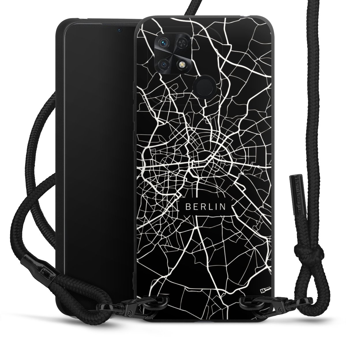 The matt black silicone case is made of flexible TPU (thermoplastic polyurethane) and offers robust protection. The durable, unbreakable material makes the cover flexible and dimensionally stable at the same time. The matte surface makes your design stand out more and is less susceptible to fingerprints and dirt. The stylish trend accessory fits comfortably in the hand and is perfectly complemented by the fabric (polyester) mobile phone strap. The braided fabric strap is approx. 1.70 metres long with a diameter of approx. 0.5 cm. Due to the special knotting technique, the length of the strap can be adjusted by simply pulling it, so that you can adapt it individually to your wishes. The practical case to wear around your neck is available with the fabric strap in black. As a little icing on the cake, we have provided the strap with a chic metal fastener in matt black. The strap is securely fastened to the case with loops made of high-quality genuine leather and press studs. The ends of the fabric strap are covered with metallic end caps and thus protected from fraying.
