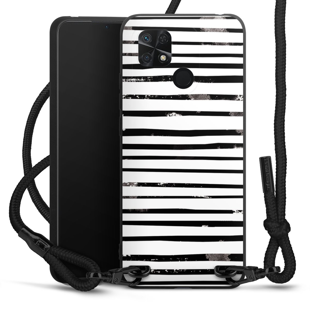 The matt black silicone case is made of flexible TPU (thermoplastic polyurethane) and offers robust protection. The durable, unbreakable material makes the cover flexible and dimensionally stable at the same time. The matte surface makes your design stand out more and is less susceptible to fingerprints and dirt. The stylish trend accessory fits comfortably in the hand and is perfectly complemented by the fabric (polyester) mobile phone strap. The braided fabric strap is approx. 1.70 metres long with a diameter of approx. 0.5 cm. Due to the special knotting technique, the length of the strap can be adjusted by simply pulling it, so that you can adapt it individually to your wishes. The practical case to wear around your neck is available with the fabric strap in black. As a little icing on the cake, we have provided the strap with a chic metal fastener in matt black. The strap is securely fastened to the case with loops made of high-quality genuine leather and press studs. The ends of the fabric strap are covered with metallic end caps and thus protected from fraying.