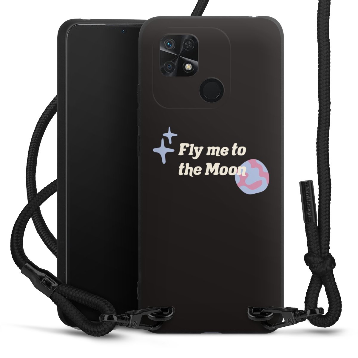 The matt black silicone case is made of flexible TPU (thermoplastic polyurethane) and offers robust protection. The durable, unbreakable material makes the cover flexible and dimensionally stable at the same time. The matte surface makes your design stand out more and is less susceptible to fingerprints and dirt. The stylish trend accessory fits comfortably in the hand and is perfectly complemented by the fabric (polyester) mobile phone strap. The braided fabric strap is approx. 1.70 metres long with a diameter of approx. 0.5 cm. Due to the special knotting technique, the length of the strap can be adjusted by simply pulling it, so that you can adapt it individually to your wishes. The practical case to wear around your neck is available with the fabric strap in black. As a little icing on the cake, we have provided the strap with a chic metal fastener in matt black. The strap is securely fastened to the case with loops made of high-quality genuine leather and press studs. The ends of the fabric strap are covered with metallic end caps and thus protected from fraying.