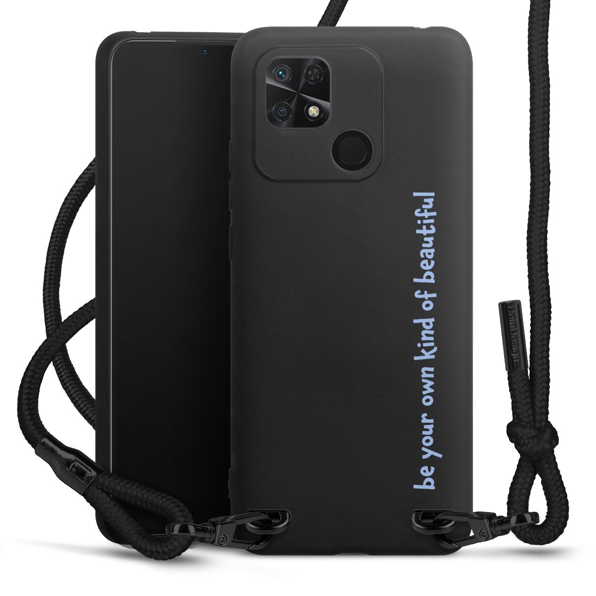 The matt black silicone case is made of flexible TPU (thermoplastic polyurethane) and offers robust protection. The durable, unbreakable material makes the cover flexible and dimensionally stable at the same time. The matte surface makes your design stand out more and is less susceptible to fingerprints and dirt. The stylish trend accessory fits comfortably in the hand and is perfectly complemented by the fabric (polyester) mobile phone strap. The braided fabric strap is approx. 1.70 metres long with a diameter of approx. 0.5 cm. Due to the special knotting technique, the length of the strap can be adjusted by simply pulling it, so that you can adapt it individually to your wishes. The practical case to wear around your neck is available with the fabric strap in black. As a little icing on the cake, we have provided the strap with a chic metal fastener in matt black. The strap is securely fastened to the case with loops made of high-quality genuine leather and press studs. The ends of the fabric strap are covered with metallic end caps and thus protected from fraying.