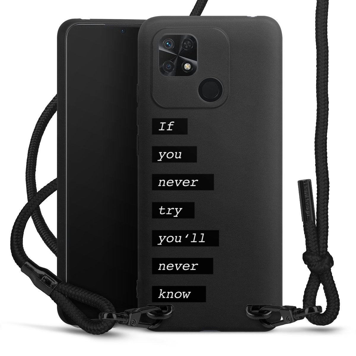 The matt black silicone case is made of flexible TPU (thermoplastic polyurethane) and offers robust protection. The durable, unbreakable material makes the cover flexible and dimensionally stable at the same time. The matte surface makes your design stand out more and is less susceptible to fingerprints and dirt. The stylish trend accessory fits comfortably in the hand and is perfectly complemented by the fabric (polyester) mobile phone strap. The braided fabric strap is approx. 1.70 metres long with a diameter of approx. 0.5 cm. Due to the special knotting technique, the length of the strap can be adjusted by simply pulling it, so that you can adapt it individually to your wishes. The practical case to wear around your neck is available with the fabric strap in black. As a little icing on the cake, we have provided the strap with a chic metal fastener in matt black. The strap is securely fastened to the case with loops made of high-quality genuine leather and press studs. The ends of the fabric strap are covered with metallic end caps and thus protected from fraying.