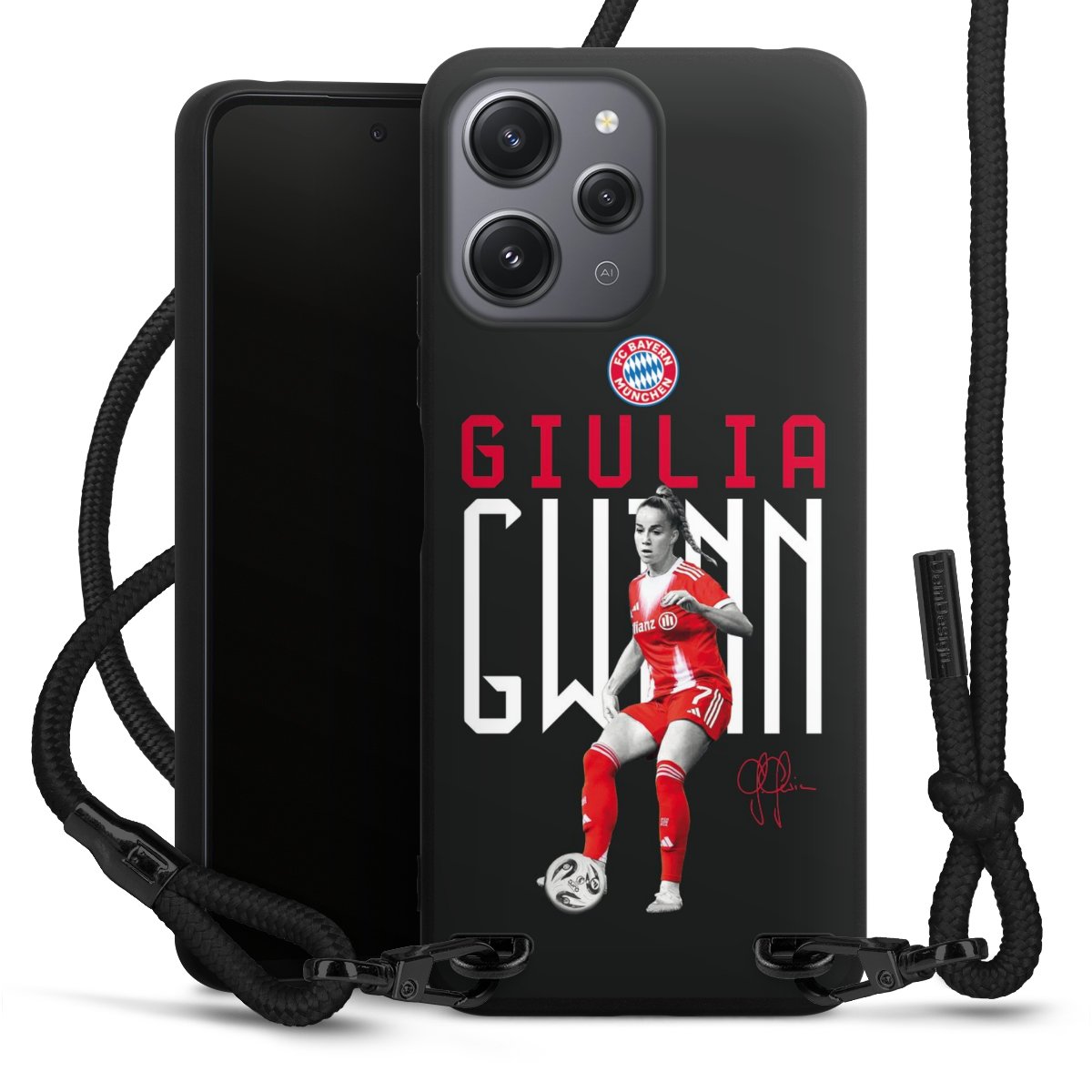 The matt black silicone case is made of flexible TPU (thermoplastic polyurethane) and offers robust protection. The durable, unbreakable material makes the cover flexible and dimensionally stable at the same time. The matte surface makes your design stand out more and is less susceptible to fingerprints and dirt. The stylish trend accessory fits comfortably in the hand and is perfectly complemented by the fabric (polyester) mobile phone strap. The braided fabric strap is approx. 1.70 metres long with a diameter of approx. 0.5 cm. Due to the special knotting technique, the length of the strap can be adjusted by simply pulling it, so that you can adapt it individually to your wishes. The practical case to wear around your neck is available with the fabric strap in black. As a little icing on the cake, we have provided the strap with a chic metal fastener in matt black. The strap is securely fastened to the case with loops made of high-quality genuine leather and press studs. The ends of the fabric strap are covered with metallic end caps and thus protected from fraying.