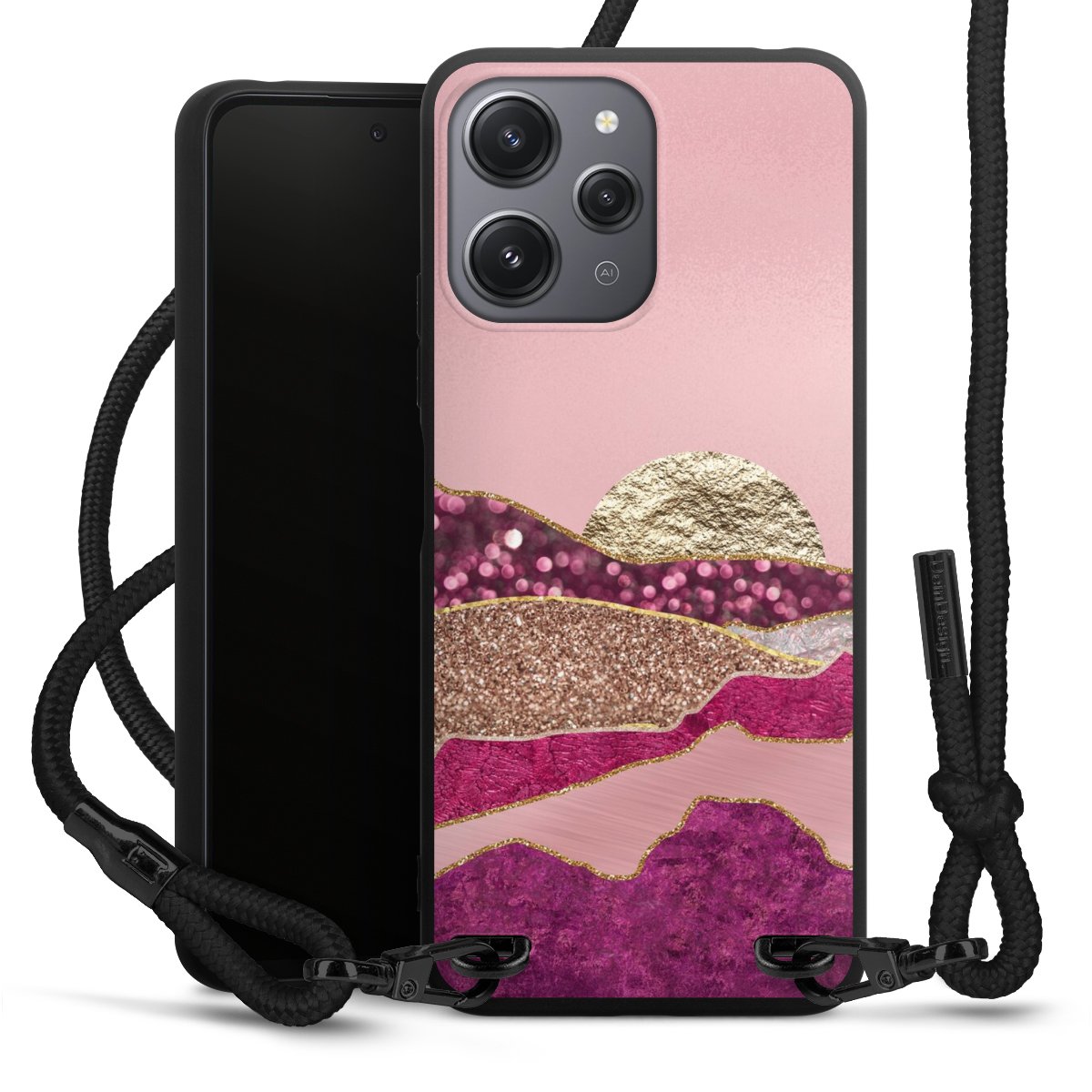 We use the solid direct print process for this phone case, which is why the print area only covers the back and the edge remains unprinted. The case to wear around your neck can be ordered unprinted, fully printed, or partially printed. For your design, either choose one of our exclusive shop motifs or get creative and create your own design, for example with photos and overlays. Design your own personal trend accessory and make an individual statement on the streets!