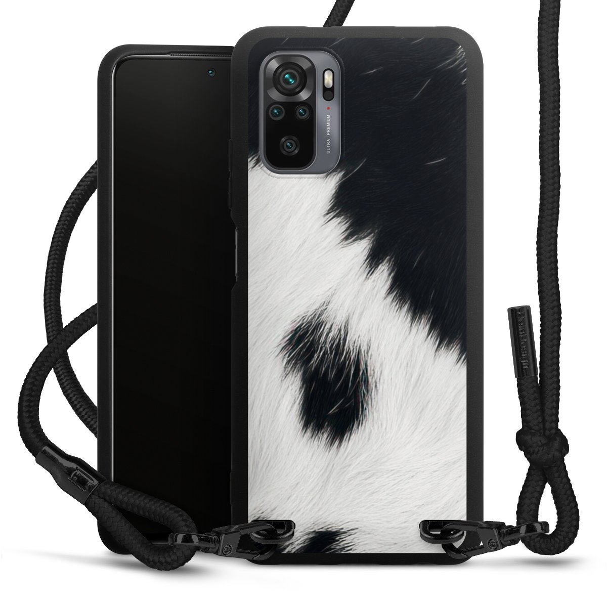 The matt black silicone case is made of flexible TPU (thermoplastic polyurethane) and offers robust protection. The durable, unbreakable material makes the cover flexible and dimensionally stable at the same time. The matte surface makes your design stand out more and is less susceptible to fingerprints and dirt. The stylish trend accessory fits comfortably in the hand and is perfectly complemented by the fabric (polyester) mobile phone strap. The braided fabric strap is approx. 1.70 metres long with a diameter of approx. 0.5 cm. Due to the special knotting technique, the length of the strap can be adjusted by simply pulling it, so that you can adapt it individually to your wishes. The practical case to wear around your neck is available with the fabric strap in black. As a little icing on the cake, we have provided the strap with a chic metal fastener in matt black. The strap is securely fastened to the case with loops made of high-quality genuine leather and press studs. The ends of the fabric strap are covered with metallic end caps and thus protected from fraying.