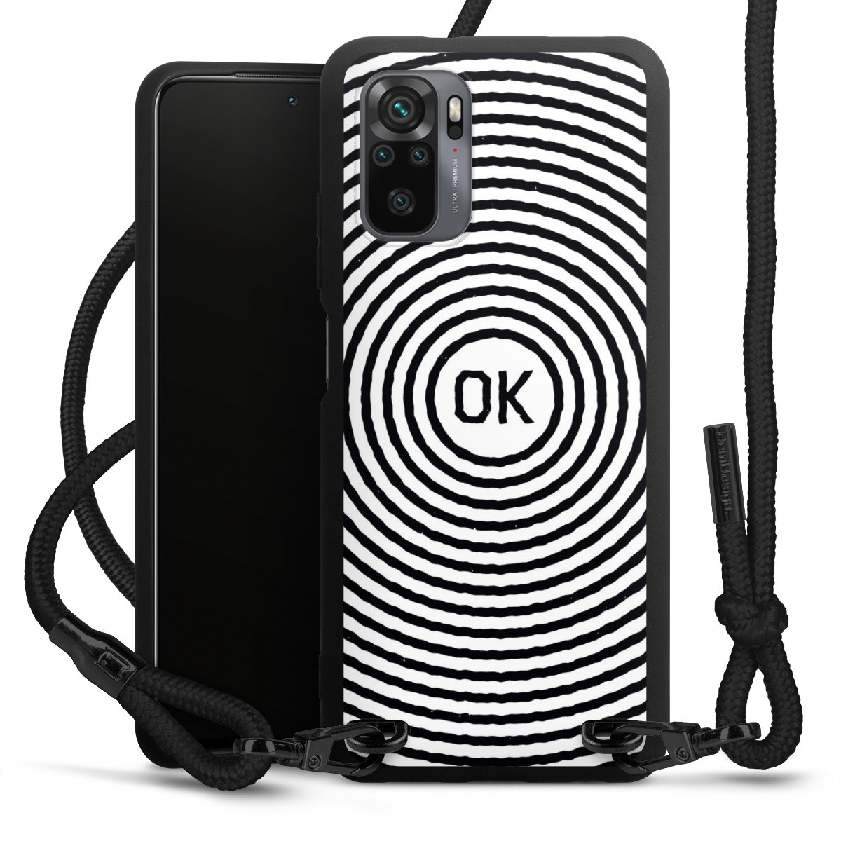 The matt black silicone case is made of flexible TPU (thermoplastic polyurethane) and offers robust protection. The durable, unbreakable material makes the cover flexible and dimensionally stable at the same time. The matte surface makes your design stand out more and is less susceptible to fingerprints and dirt. The stylish trend accessory fits comfortably in the hand and is perfectly complemented by the fabric (polyester) mobile phone strap. The braided fabric strap is approx. 1.70 metres long with a diameter of approx. 0.5 cm. Due to the special knotting technique, the length of the strap can be adjusted by simply pulling it, so that you can adapt it individually to your wishes. The practical case to wear around your neck is available with the fabric strap in black. As a little icing on the cake, we have provided the strap with a chic metal fastener in matt black. The strap is securely fastened to the case with loops made of high-quality genuine leather and press studs. The ends of the fabric strap are covered with metallic end caps and thus protected from fraying.