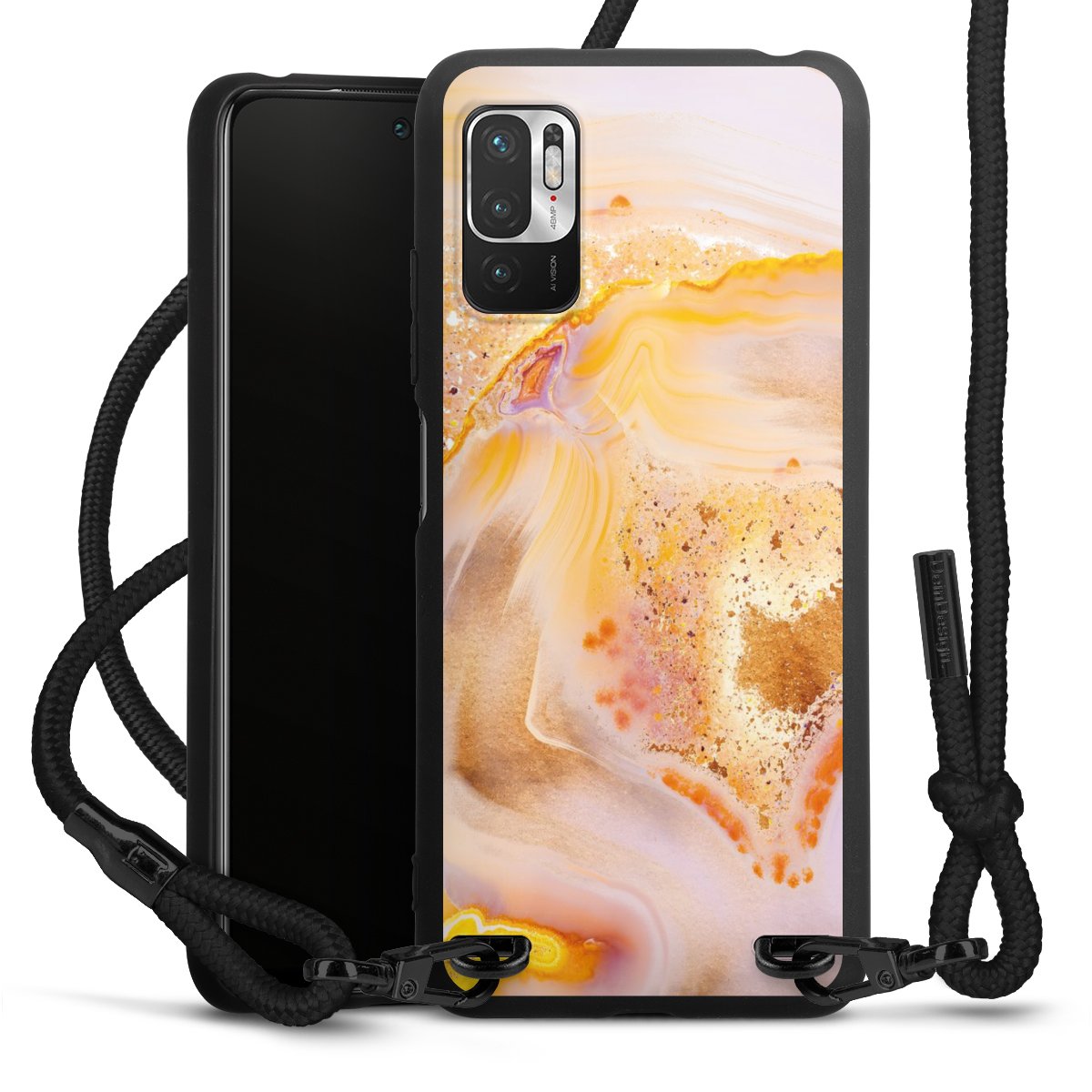 The matt black silicone case is made of flexible TPU (thermoplastic polyurethane) and offers robust protection. The durable, unbreakable material makes the cover flexible and dimensionally stable at the same time. The matte surface makes your design stand out more and is less susceptible to fingerprints and dirt. The stylish trend accessory fits comfortably in the hand and is perfectly complemented by the fabric (polyester) mobile phone strap. The braided fabric strap is approx. 1.70 metres long with a diameter of approx. 0.5 cm. Due to the special knotting technique, the length of the strap can be adjusted by simply pulling it, so that you can adapt it individually to your wishes. The practical case to wear around your neck is available with the fabric strap in black. As a little icing on the cake, we have provided the strap with a chic metal fastener in matt black. The strap is securely fastened to the case with loops made of high-quality genuine leather and press studs. The ends of the fabric strap are covered with metallic end caps and thus protected from fraying.