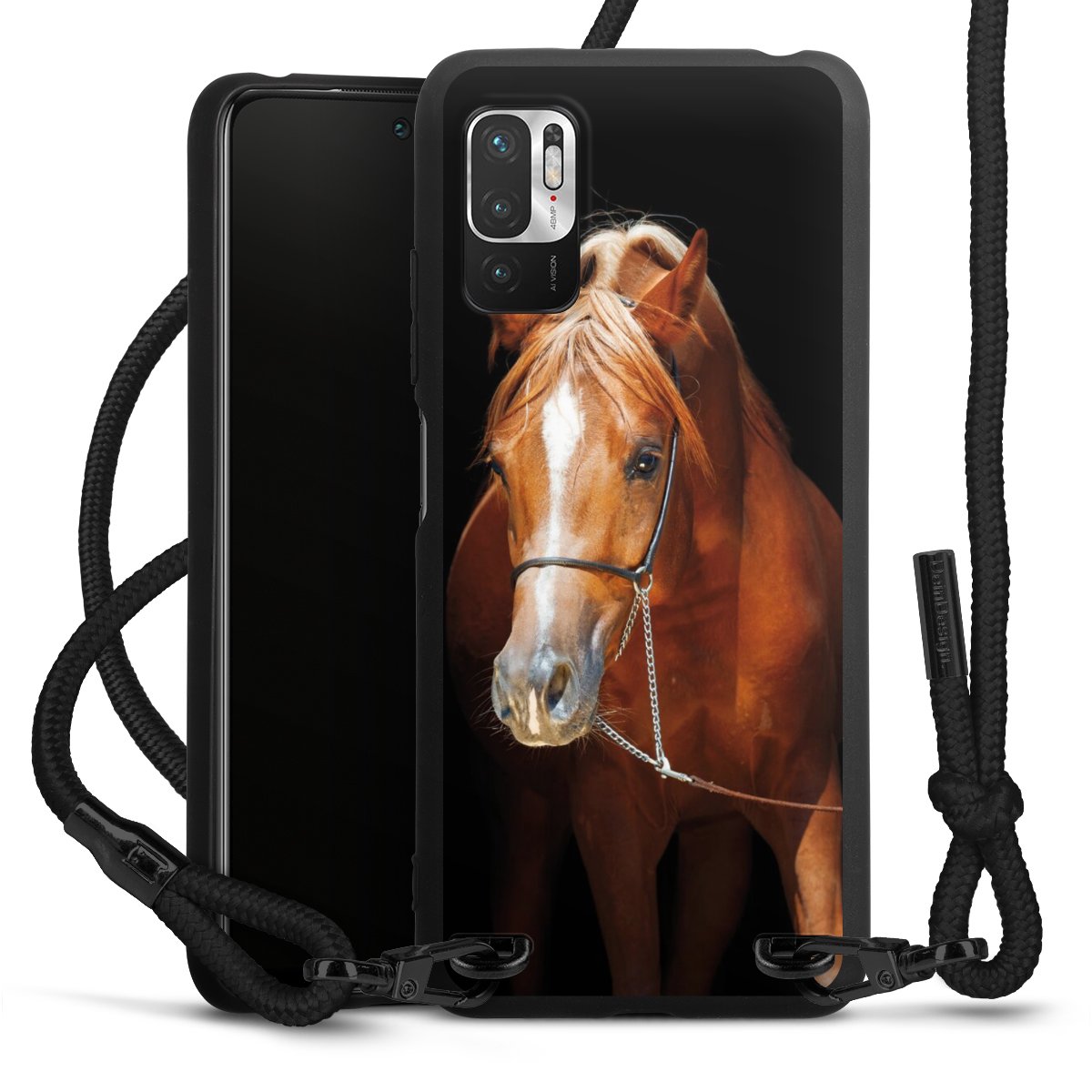 The matt black silicone case is made of flexible TPU (thermoplastic polyurethane) and offers robust protection. The durable, unbreakable material makes the cover flexible and dimensionally stable at the same time. The matte surface makes your design stand out more and is less susceptible to fingerprints and dirt. The stylish trend accessory fits comfortably in the hand and is perfectly complemented by the fabric (polyester) mobile phone strap. The braided fabric strap is approx. 1.70 metres long with a diameter of approx. 0.5 cm. Due to the special knotting technique, the length of the strap can be adjusted by simply pulling it, so that you can adapt it individually to your wishes. The practical case to wear around your neck is available with the fabric strap in black. As a little icing on the cake, we have provided the strap with a chic metal fastener in matt black. The strap is securely fastened to the case with loops made of high-quality genuine leather and press studs. The ends of the fabric strap are covered with metallic end caps and thus protected from fraying.