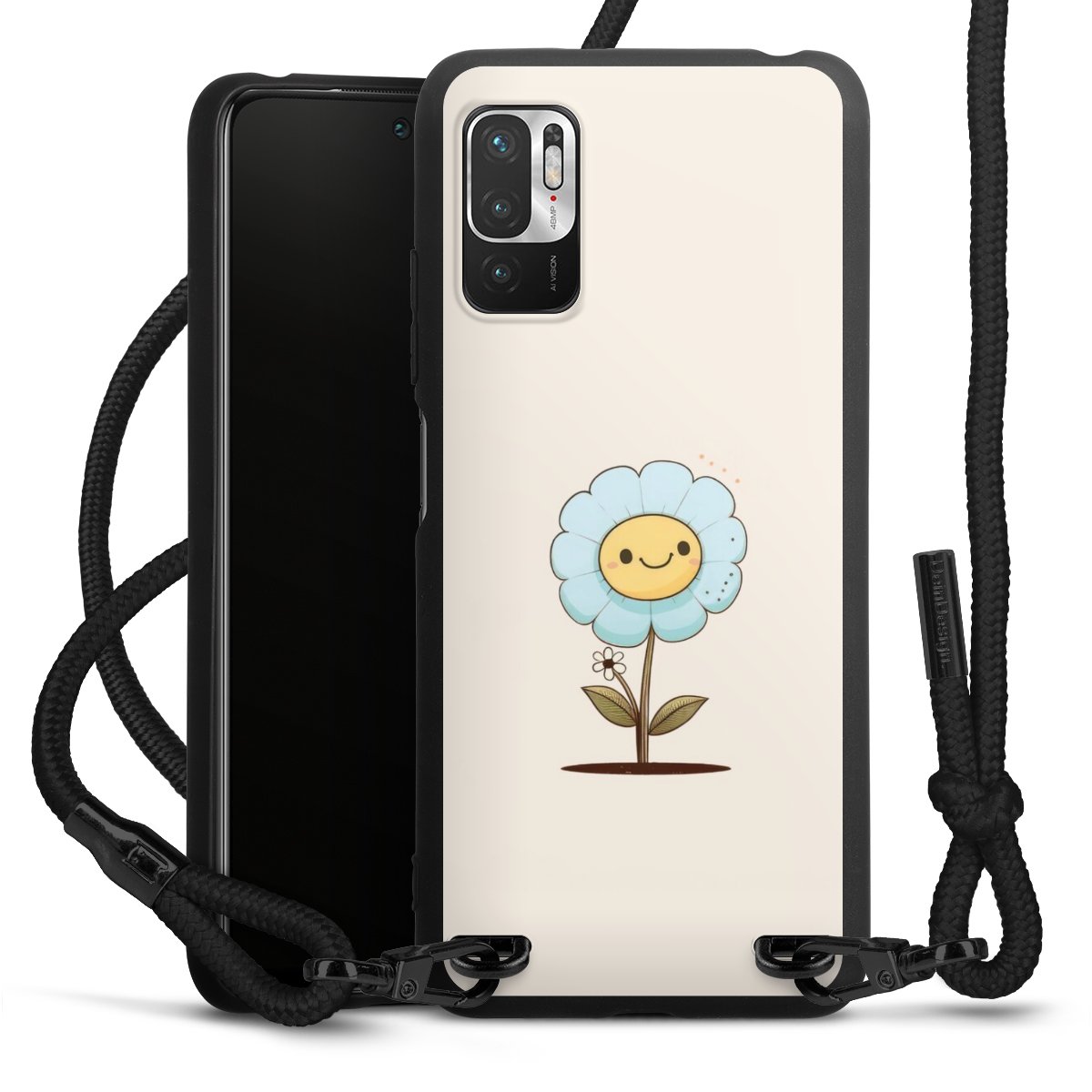 The matt black silicone case is made of flexible TPU (thermoplastic polyurethane) and offers robust protection. The durable, unbreakable material makes the cover flexible and dimensionally stable at the same time. The matte surface makes your design stand out more and is less susceptible to fingerprints and dirt. The stylish trend accessory fits comfortably in the hand and is perfectly complemented by the fabric (polyester) mobile phone strap. The braided fabric strap is approx. 1.70 metres long with a diameter of approx. 0.5 cm. Due to the special knotting technique, the length of the strap can be adjusted by simply pulling it, so that you can adapt it individually to your wishes. The practical case to wear around your neck is available with the fabric strap in black. As a little icing on the cake, we have provided the strap with a chic metal fastener in matt black. The strap is securely fastened to the case with loops made of high-quality genuine leather and press studs. The ends of the fabric strap are covered with metallic end caps and thus protected from fraying.