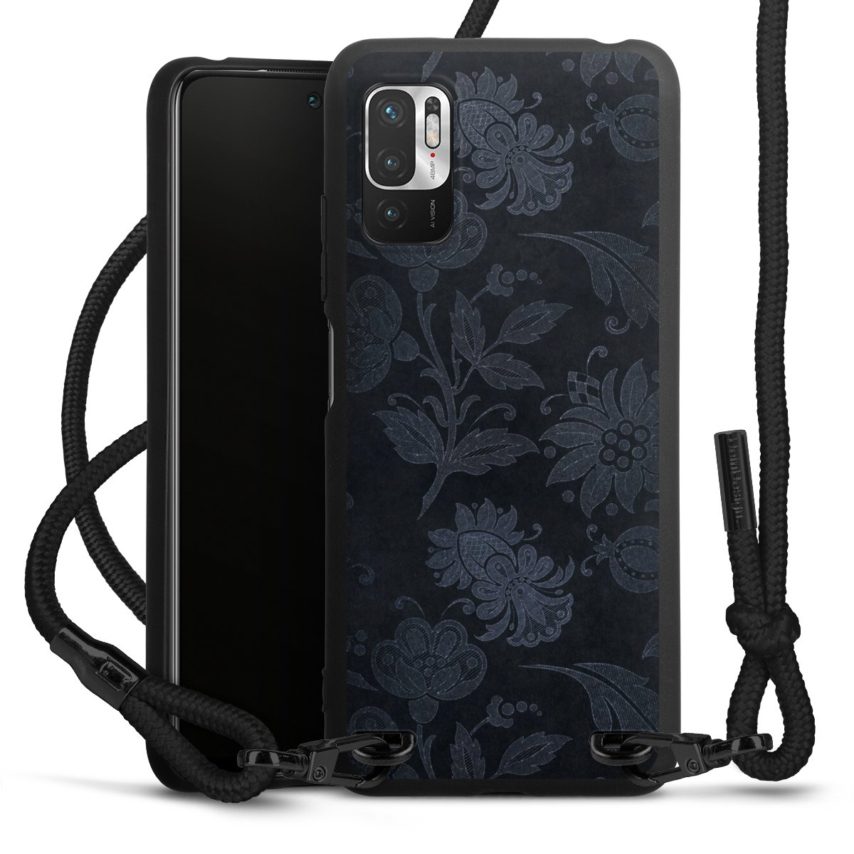 The matt black silicone case is made of flexible TPU (thermoplastic polyurethane) and offers robust protection. The durable, unbreakable material makes the cover flexible and dimensionally stable at the same time. The matte surface makes your design stand out more and is less susceptible to fingerprints and dirt. The stylish trend accessory fits comfortably in the hand and is perfectly complemented by the fabric (polyester) mobile phone strap. The braided fabric strap is approx. 1.70 metres long with a diameter of approx. 0.5 cm. Due to the special knotting technique, the length of the strap can be adjusted by simply pulling it, so that you can adapt it individually to your wishes. The practical case to wear around your neck is available with the fabric strap in black. As a little icing on the cake, we have provided the strap with a chic metal fastener in matt black. The strap is securely fastened to the case with loops made of high-quality genuine leather and press studs. The ends of the fabric strap are covered with metallic end caps and thus protected from fraying.