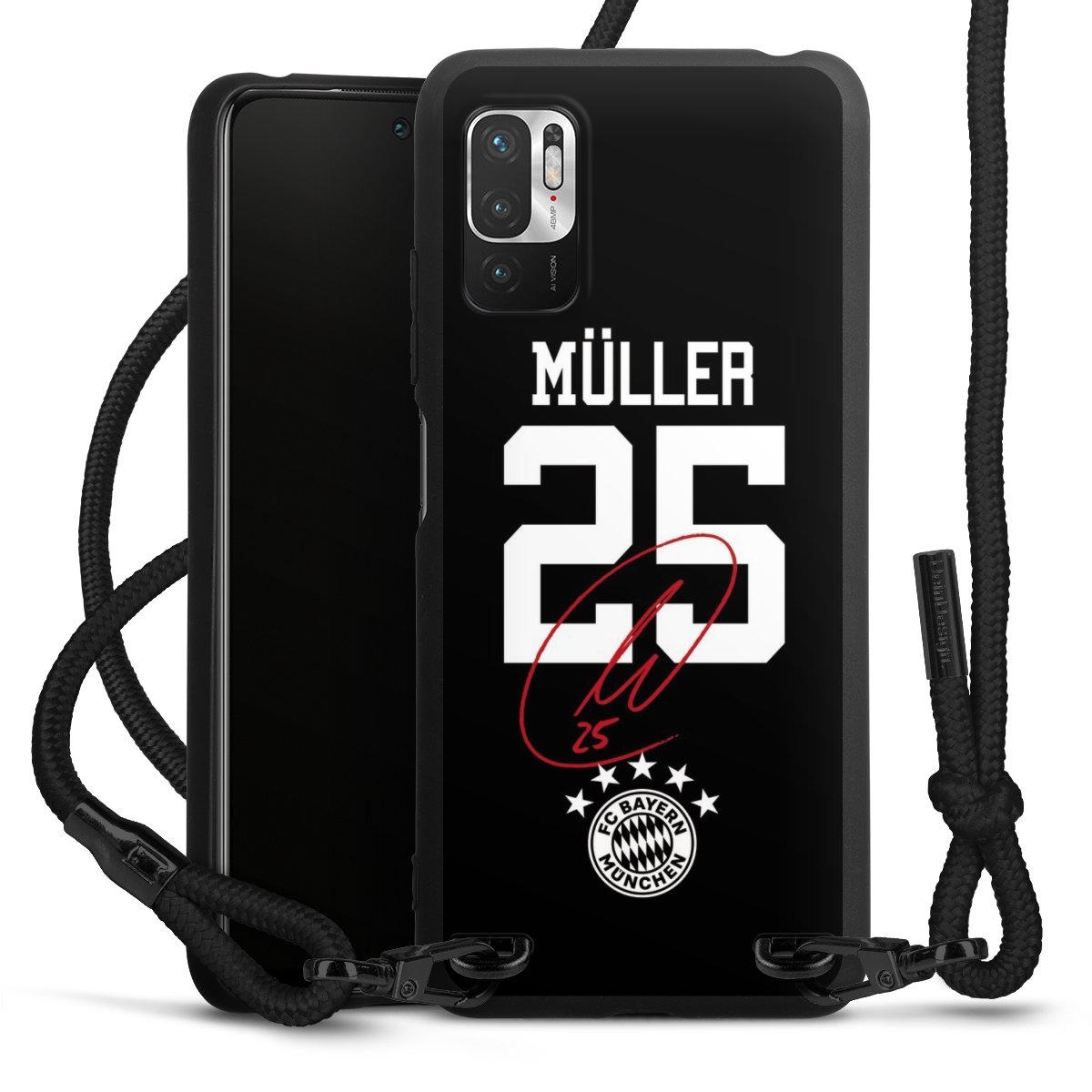 The matt black silicone case is made of flexible TPU (thermoplastic polyurethane) and offers robust protection. The durable, unbreakable material makes the cover flexible and dimensionally stable at the same time. The matte surface makes your design stand out more and is less susceptible to fingerprints and dirt. The stylish trend accessory fits comfortably in the hand and is perfectly complemented by the fabric (polyester) mobile phone strap. The braided fabric strap is approx. 1.70 metres long with a diameter of approx. 0.5 cm. Due to the special knotting technique, the length of the strap can be adjusted by simply pulling it, so that you can adapt it individually to your wishes. The practical case to wear around your neck is available with the fabric strap in black. As a little icing on the cake, we have provided the strap with a chic metal fastener in matt black. The strap is securely fastened to the case with loops made of high-quality genuine leather and press studs. The ends of the fabric strap are covered with metallic end caps and thus protected from fraying.