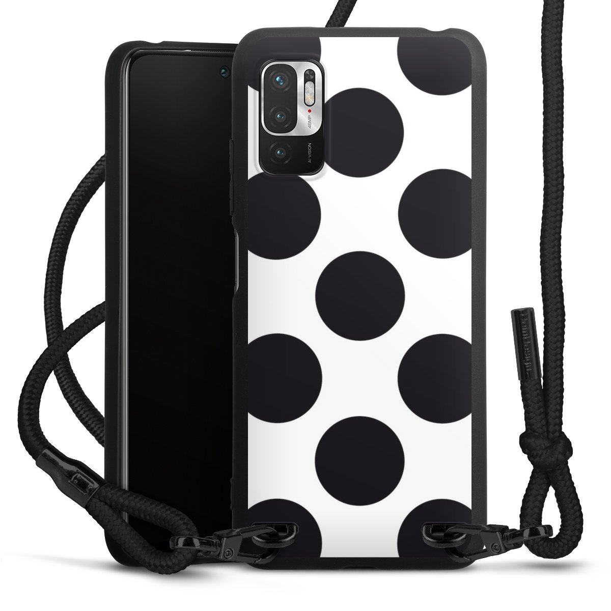 The matt black silicone case is made of flexible TPU (thermoplastic polyurethane) and offers robust protection. The durable, unbreakable material makes the cover flexible and dimensionally stable at the same time. The matte surface makes your design stand out more and is less susceptible to fingerprints and dirt. The stylish trend accessory fits comfortably in the hand and is perfectly complemented by the fabric (polyester) mobile phone strap. The braided fabric strap is approx. 1.70 metres long with a diameter of approx. 0.5 cm. Due to the special knotting technique, the length of the strap can be adjusted by simply pulling it, so that you can adapt it individually to your wishes. The practical case to wear around your neck is available with the fabric strap in black. As a little icing on the cake, we have provided the strap with a chic metal fastener in matt black. The strap is securely fastened to the case with loops made of high-quality genuine leather and press studs. The ends of the fabric strap are covered with metallic end caps and thus protected from fraying.
