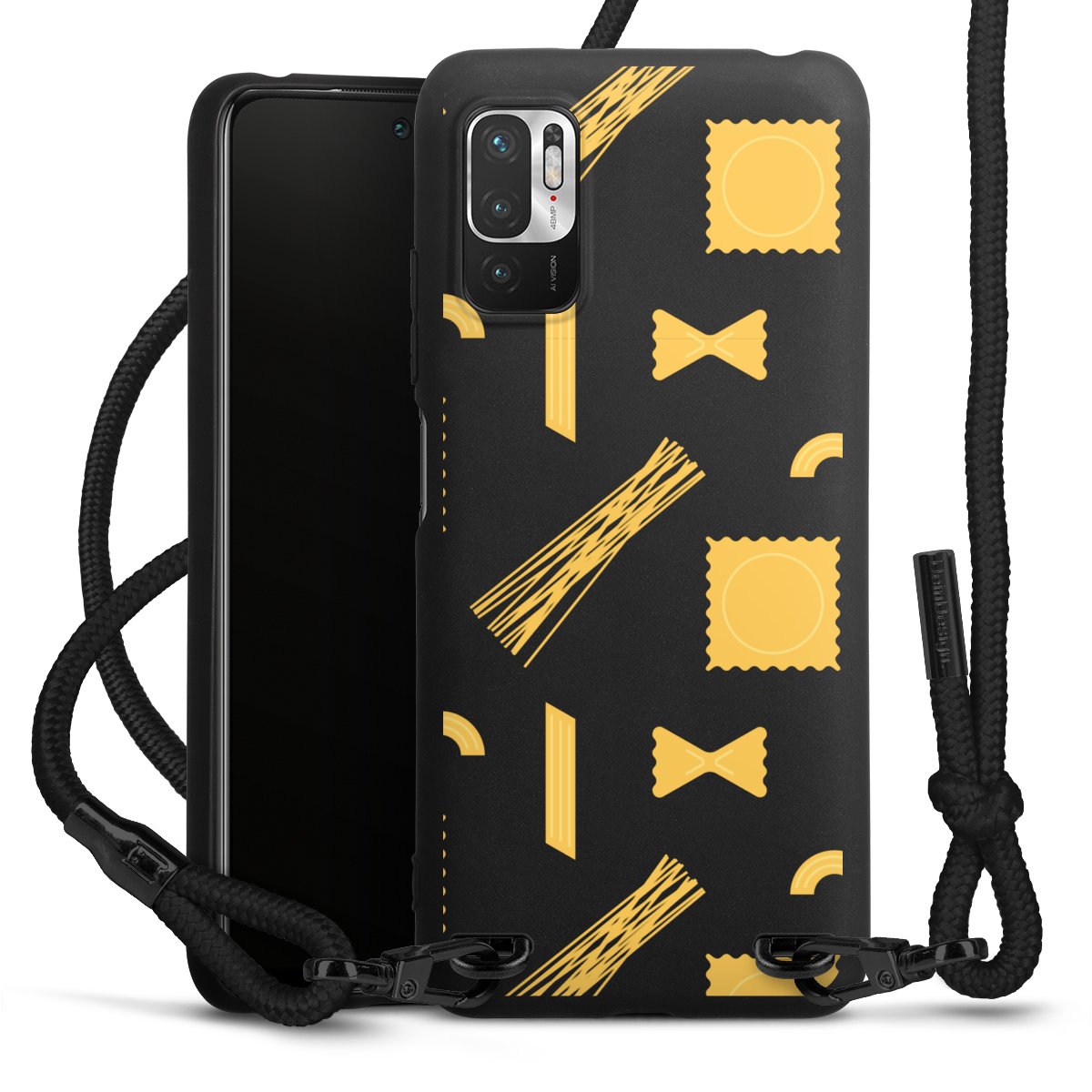 The matt black silicone case is made of flexible TPU (thermoplastic polyurethane) and offers robust protection. The durable, unbreakable material makes the cover flexible and dimensionally stable at the same time. The matte surface makes your design stand out more and is less susceptible to fingerprints and dirt. The stylish trend accessory fits comfortably in the hand and is perfectly complemented by the fabric (polyester) mobile phone strap. The braided fabric strap is approx. 1.70 metres long with a diameter of approx. 0.5 cm. Due to the special knotting technique, the length of the strap can be adjusted by simply pulling it, so that you can adapt it individually to your wishes. The practical case to wear around your neck is available with the fabric strap in black. As a little icing on the cake, we have provided the strap with a chic metal fastener in matt black. The strap is securely fastened to the case with loops made of high-quality genuine leather and press studs. The ends of the fabric strap are covered with metallic end caps and thus protected from fraying.