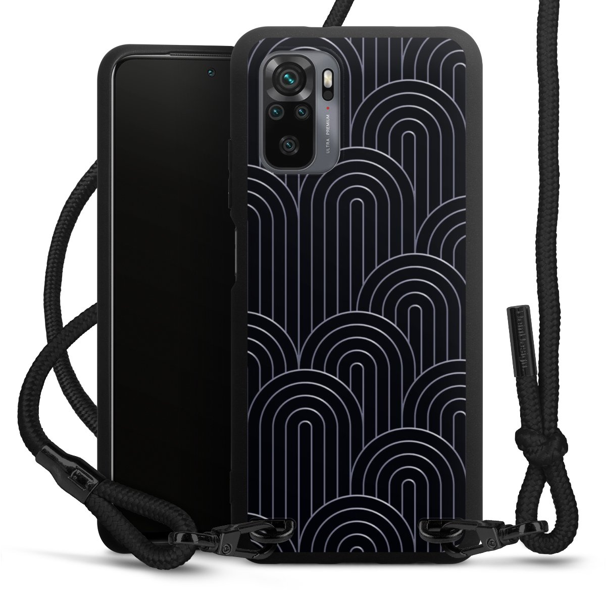 The matt black silicone case is made of flexible TPU (thermoplastic polyurethane) and offers robust protection. The durable, unbreakable material makes the cover flexible and dimensionally stable at the same time. The matte surface makes your design stand out more and is less susceptible to fingerprints and dirt. The stylish trend accessory fits comfortably in the hand and is perfectly complemented by the fabric (polyester) mobile phone strap. The braided fabric strap is approx. 1.70 metres long with a diameter of approx. 0.5 cm. Due to the special knotting technique, the length of the strap can be adjusted by simply pulling it, so that you can adapt it individually to your wishes. The practical case to wear around your neck is available with the fabric strap in black. As a little icing on the cake, we have provided the strap with a chic metal fastener in matt black. The strap is securely fastened to the case with loops made of high-quality genuine leather and press studs. The ends of the fabric strap are covered with metallic end caps and thus protected from fraying.