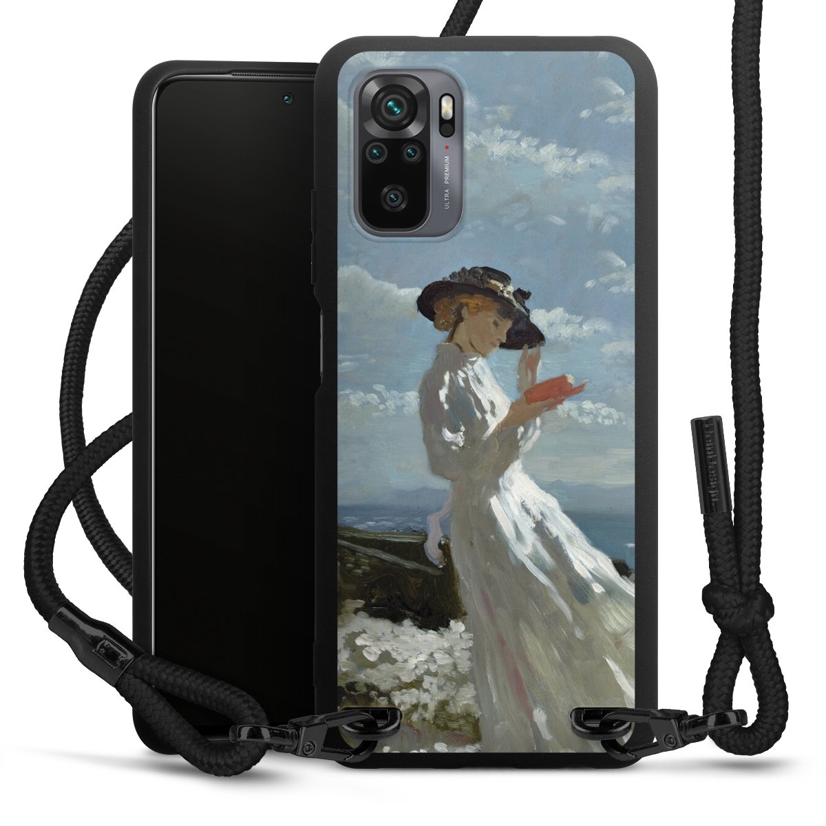 The matt black silicone case is made of flexible TPU (thermoplastic polyurethane) and offers robust protection. The durable, unbreakable material makes the cover flexible and dimensionally stable at the same time. The matte surface makes your design stand out more and is less susceptible to fingerprints and dirt. The stylish trend accessory fits comfortably in the hand and is perfectly complemented by the fabric (polyester) mobile phone strap. The braided fabric strap is approx. 1.70 metres long with a diameter of approx. 0.5 cm. Due to the special knotting technique, the length of the strap can be adjusted by simply pulling it, so that you can adapt it individually to your wishes. The practical case to wear around your neck is available with the fabric strap in black. As a little icing on the cake, we have provided the strap with a chic metal fastener in matt black. The strap is securely fastened to the case with loops made of high-quality genuine leather and press studs. The ends of the fabric strap are covered with metallic end caps and thus protected from fraying.