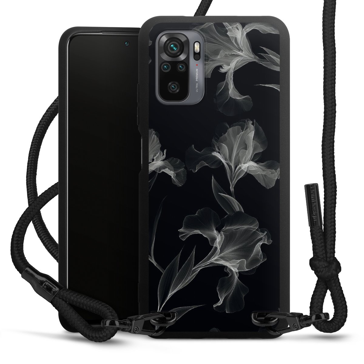 The matt black silicone case is made of flexible TPU (thermoplastic polyurethane) and offers robust protection. The durable, unbreakable material makes the cover flexible and dimensionally stable at the same time. The matte surface makes your design stand out more and is less susceptible to fingerprints and dirt. The stylish trend accessory fits comfortably in the hand and is perfectly complemented by the fabric (polyester) mobile phone strap. The braided fabric strap is approx. 1.70 metres long with a diameter of approx. 0.5 cm. Due to the special knotting technique, the length of the strap can be adjusted by simply pulling it, so that you can adapt it individually to your wishes. The practical case to wear around your neck is available with the fabric strap in black. As a little icing on the cake, we have provided the strap with a chic metal fastener in matt black. The strap is securely fastened to the case with loops made of high-quality genuine leather and press studs. The ends of the fabric strap are covered with metallic end caps and thus protected from fraying.