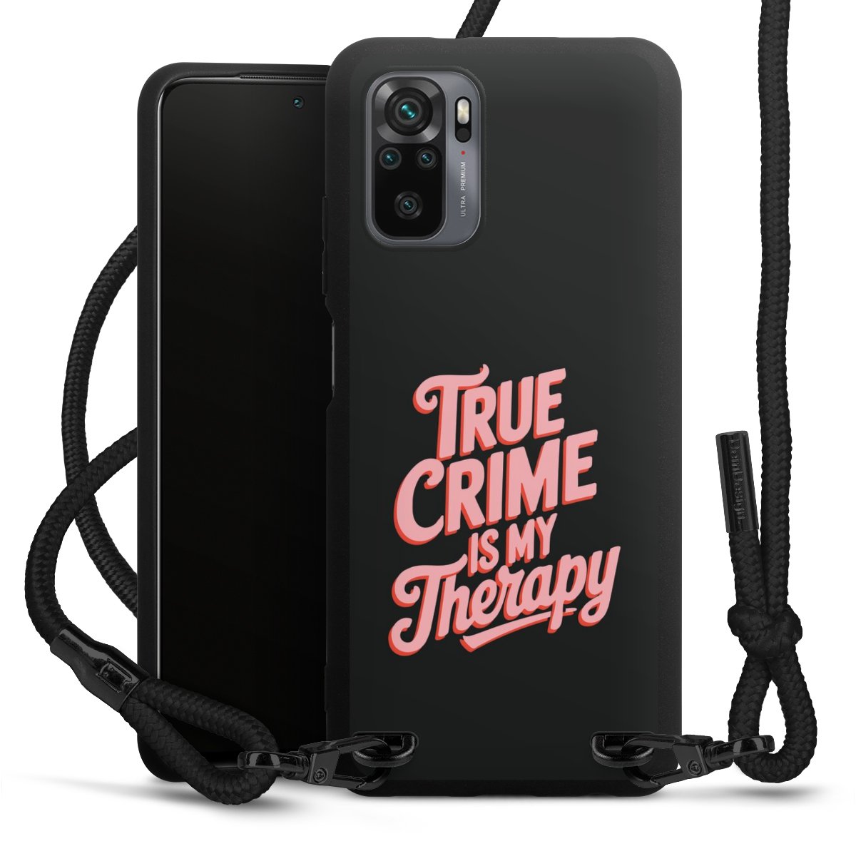 The matt black silicone case is made of flexible TPU (thermoplastic polyurethane) and offers robust protection. The durable, unbreakable material makes the cover flexible and dimensionally stable at the same time. The matte surface makes your design stand out more and is less susceptible to fingerprints and dirt. The stylish trend accessory fits comfortably in the hand and is perfectly complemented by the fabric (polyester) mobile phone strap. The braided fabric strap is approx. 1.70 metres long with a diameter of approx. 0.5 cm. Due to the special knotting technique, the length of the strap can be adjusted by simply pulling it, so that you can adapt it individually to your wishes. The practical case to wear around your neck is available with the fabric strap in black. As a little icing on the cake, we have provided the strap with a chic metal fastener in matt black. The strap is securely fastened to the case with loops made of high-quality genuine leather and press studs. The ends of the fabric strap are covered with metallic end caps and thus protected from fraying.