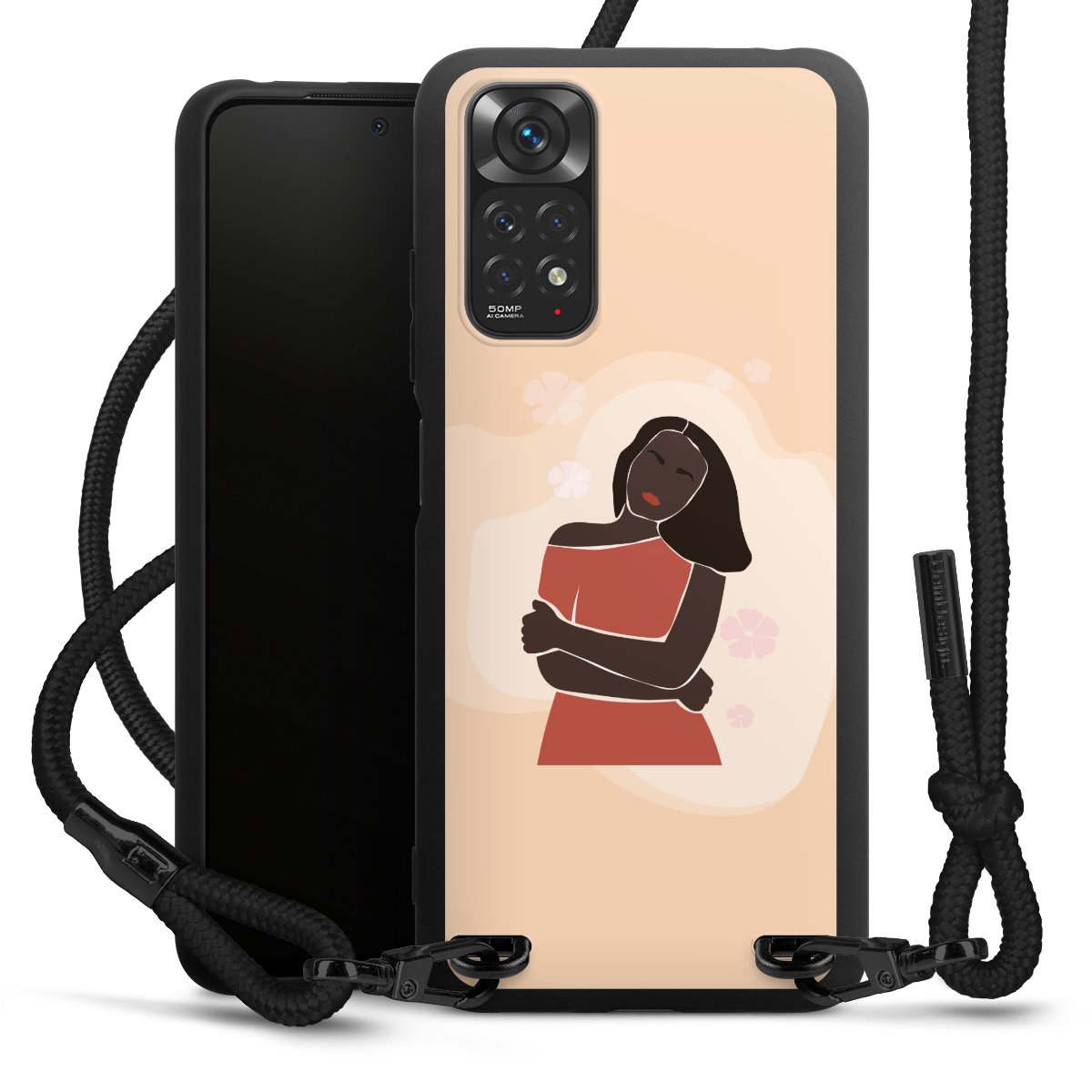 The matt black silicone case is made of flexible TPU (thermoplastic polyurethane) and offers robust protection. The durable, unbreakable material makes the cover flexible and dimensionally stable at the same time. The matte surface makes your design stand out more and is less susceptible to fingerprints and dirt. The stylish trend accessory fits comfortably in the hand and is perfectly complemented by the fabric (polyester) mobile phone strap. The braided fabric strap is approx. 1.70 metres long with a diameter of approx. 0.5 cm. Due to the special knotting technique, the length of the strap can be adjusted by simply pulling it, so that you can adapt it individually to your wishes. The practical case to wear around your neck is available with the fabric strap in black. As a little icing on the cake, we have provided the strap with a chic metal fastener in matt black. The strap is securely fastened to the case with loops made of high-quality genuine leather and press studs. The ends of the fabric strap are covered with metallic end caps and thus protected from fraying.