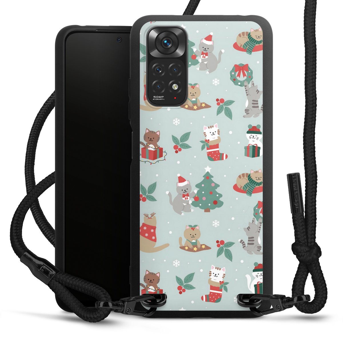 The matt black silicone case is made of flexible TPU (thermoplastic polyurethane) and offers robust protection. The durable, unbreakable material makes the cover flexible and dimensionally stable at the same time. The matte surface makes your design stand out more and is less susceptible to fingerprints and dirt. The stylish trend accessory fits comfortably in the hand and is perfectly complemented by the fabric (polyester) mobile phone strap. The braided fabric strap is approx. 1.70 metres long with a diameter of approx. 0.5 cm. Due to the special knotting technique, the length of the strap can be adjusted by simply pulling it, so that you can adapt it individually to your wishes. The practical case to wear around your neck is available with the fabric strap in black. As a little icing on the cake, we have provided the strap with a chic metal fastener in matt black. The strap is securely fastened to the case with loops made of high-quality genuine leather and press studs. The ends of the fabric strap are covered with metallic end caps and thus protected from fraying.