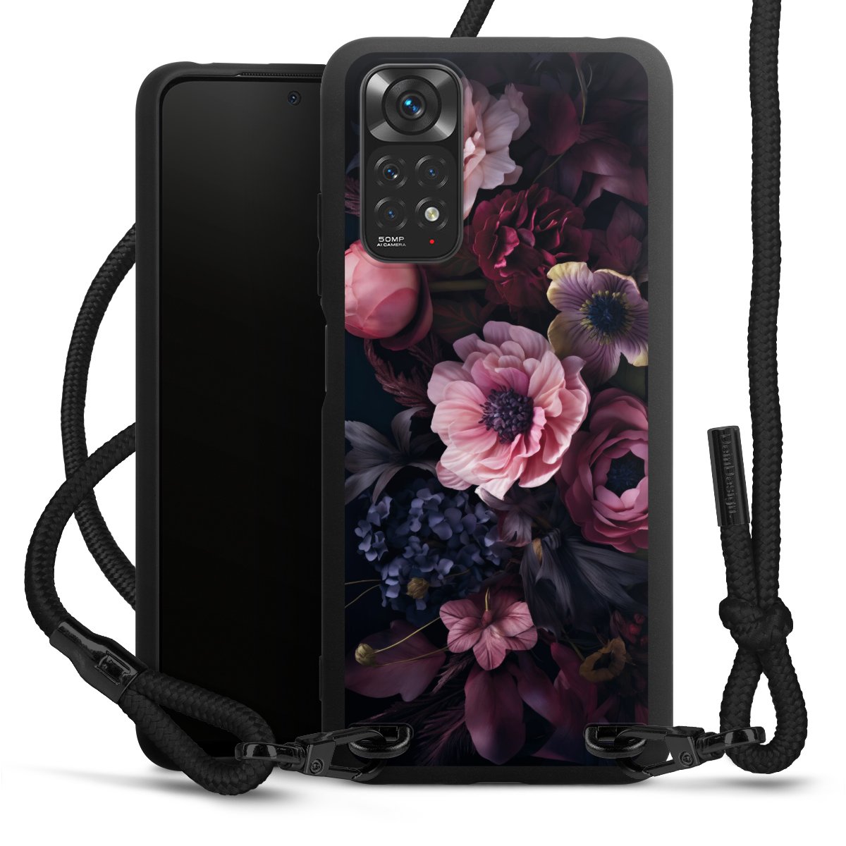 The matt black silicone case is made of flexible TPU (thermoplastic polyurethane) and offers robust protection. The durable, unbreakable material makes the cover flexible and dimensionally stable at the same time. The matte surface makes your design stand out more and is less susceptible to fingerprints and dirt. The stylish trend accessory fits comfortably in the hand and is perfectly complemented by the fabric (polyester) mobile phone strap. The braided fabric strap is approx. 1.70 metres long with a diameter of approx. 0.5 cm. Due to the special knotting technique, the length of the strap can be adjusted by simply pulling it, so that you can adapt it individually to your wishes. The practical case to wear around your neck is available with the fabric strap in black. As a little icing on the cake, we have provided the strap with a chic metal fastener in matt black. The strap is securely fastened to the case with loops made of high-quality genuine leather and press studs. The ends of the fabric strap are covered with metallic end caps and thus protected from fraying.