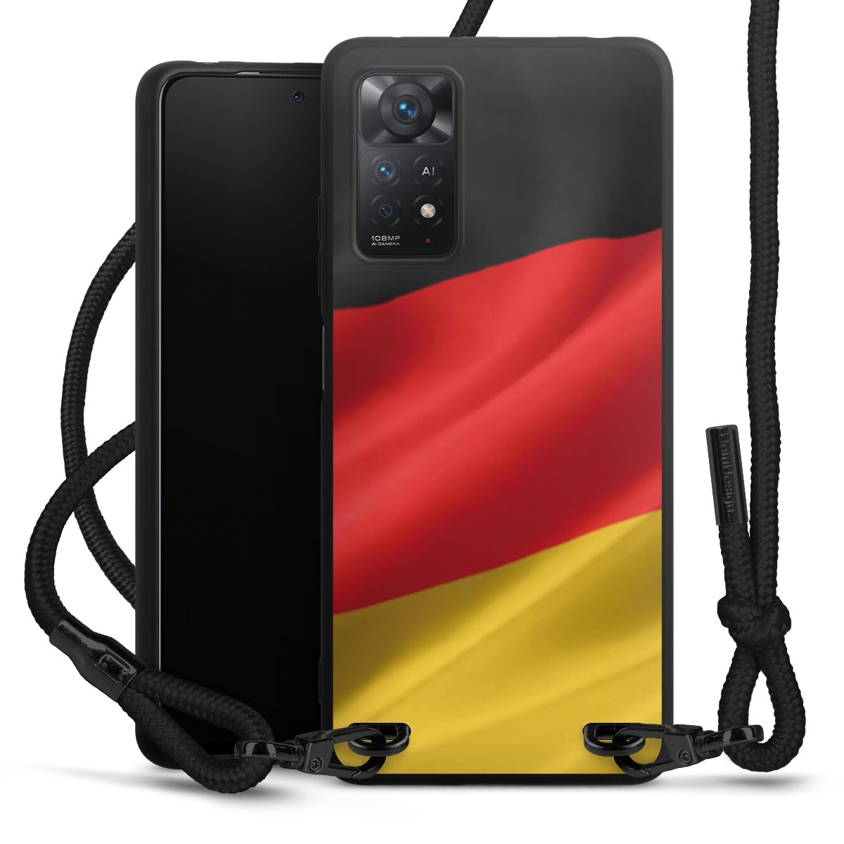 The matt black silicone case is made of flexible TPU (thermoplastic polyurethane) and offers robust protection. The durable, unbreakable material makes the cover flexible and dimensionally stable at the same time. The matte surface makes your design stand out more and is less susceptible to fingerprints and dirt. The stylish trend accessory fits comfortably in the hand and is perfectly complemented by the fabric (polyester) mobile phone strap. The braided fabric strap is approx. 1.70 metres long with a diameter of approx. 0.5 cm. Due to the special knotting technique, the length of the strap can be adjusted by simply pulling it, so that you can adapt it individually to your wishes. The practical case to wear around your neck is available with the fabric strap in black. As a little icing on the cake, we have provided the strap with a chic metal fastener in matt black. The strap is securely fastened to the case with loops made of high-quality genuine leather and press studs. The ends of the fabric strap are covered with metallic end caps and thus protected from fraying.