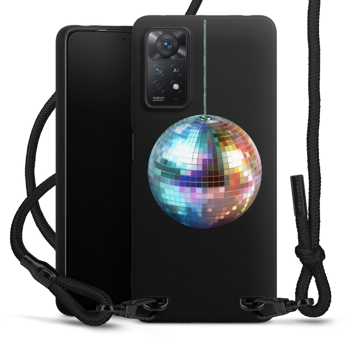 The matt black silicone case is made of flexible TPU (thermoplastic polyurethane) and offers robust protection. The durable, unbreakable material makes the cover flexible and dimensionally stable at the same time. The matte surface makes your design stand out more and is less susceptible to fingerprints and dirt. The stylish trend accessory fits comfortably in the hand and is perfectly complemented by the fabric (polyester) mobile phone strap. The braided fabric strap is approx. 1.70 metres long with a diameter of approx. 0.5 cm. Due to the special knotting technique, the length of the strap can be adjusted by simply pulling it, so that you can adapt it individually to your wishes. The practical case to wear around your neck is available with the fabric strap in black. As a little icing on the cake, we have provided the strap with a chic metal fastener in matt black. The strap is securely fastened to the case with loops made of high-quality genuine leather and press studs. The ends of the fabric strap are covered with metallic end caps and thus protected from fraying.