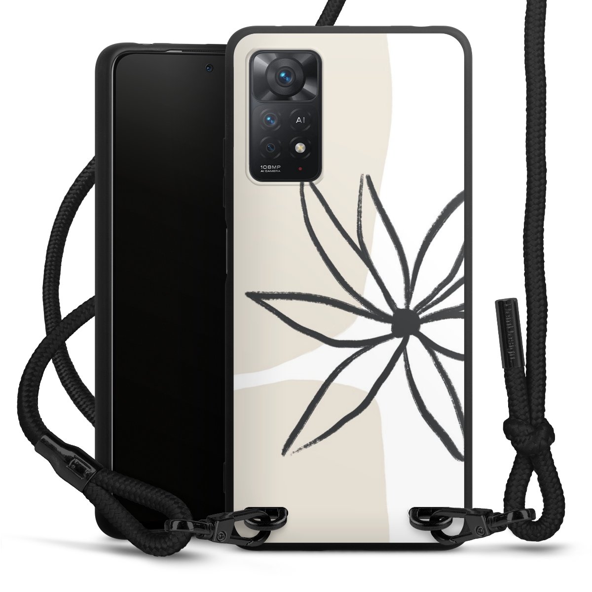 The matt black silicone case is made of flexible TPU (thermoplastic polyurethane) and offers robust protection. The durable, unbreakable material makes the cover flexible and dimensionally stable at the same time. The matte surface makes your design stand out more and is less susceptible to fingerprints and dirt. The stylish trend accessory fits comfortably in the hand and is perfectly complemented by the fabric (polyester) mobile phone strap. The braided fabric strap is approx. 1.70 metres long with a diameter of approx. 0.5 cm. Due to the special knotting technique, the length of the strap can be adjusted by simply pulling it, so that you can adapt it individually to your wishes. The practical case to wear around your neck is available with the fabric strap in black. As a little icing on the cake, we have provided the strap with a chic metal fastener in matt black. The strap is securely fastened to the case with loops made of high-quality genuine leather and press studs. The ends of the fabric strap are covered with metallic end caps and thus protected from fraying.