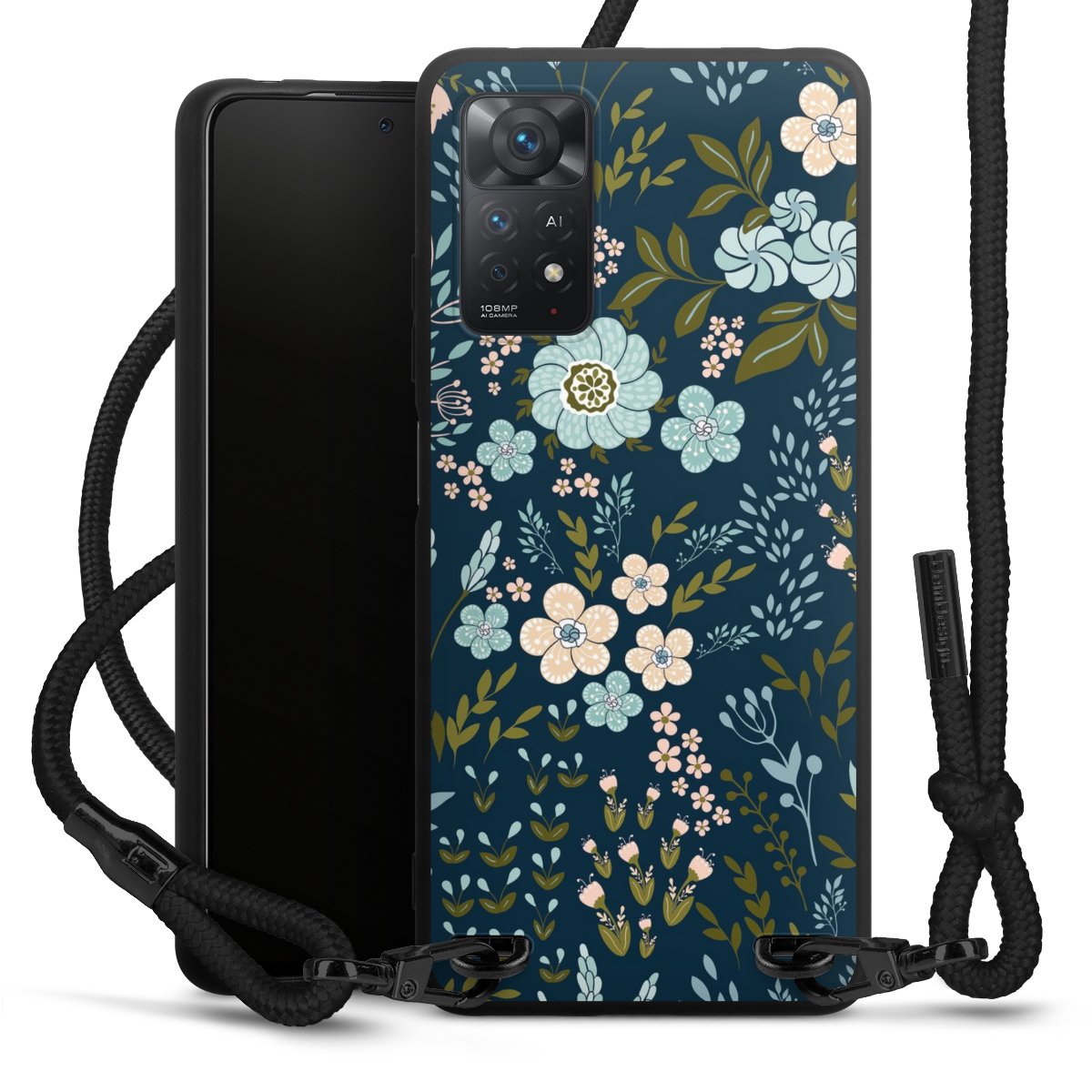 The matt black silicone case is made of flexible TPU (thermoplastic polyurethane) and offers robust protection. The durable, unbreakable material makes the cover flexible and dimensionally stable at the same time. The matte surface makes your design stand out more and is less susceptible to fingerprints and dirt. The stylish trend accessory fits comfortably in the hand and is perfectly complemented by the fabric (polyester) mobile phone strap. The braided fabric strap is approx. 1.70 metres long with a diameter of approx. 0.5 cm. Due to the special knotting technique, the length of the strap can be adjusted by simply pulling it, so that you can adapt it individually to your wishes. The practical case to wear around your neck is available with the fabric strap in black. As a little icing on the cake, we have provided the strap with a chic metal fastener in matt black. The strap is securely fastened to the case with loops made of high-quality genuine leather and press studs. The ends of the fabric strap are covered with metallic end caps and thus protected from fraying.