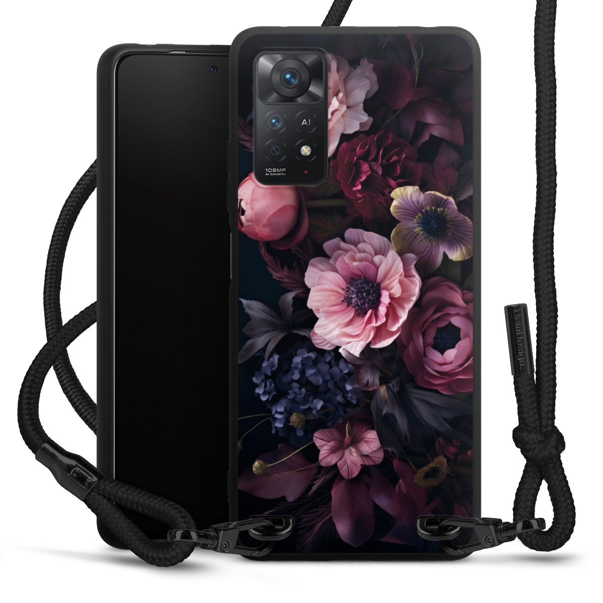 The matt black silicone case is made of flexible TPU (thermoplastic polyurethane) and offers robust protection. The durable, unbreakable material makes the cover flexible and dimensionally stable at the same time. The matte surface makes your design stand out more and is less susceptible to fingerprints and dirt. The stylish trend accessory fits comfortably in the hand and is perfectly complemented by the fabric (polyester) mobile phone strap. The braided fabric strap is approx. 1.70 metres long with a diameter of approx. 0.5 cm. Due to the special knotting technique, the length of the strap can be adjusted by simply pulling it, so that you can adapt it individually to your wishes. The practical case to wear around your neck is available with the fabric strap in black. As a little icing on the cake, we have provided the strap with a chic metal fastener in matt black. The strap is securely fastened to the case with loops made of high-quality genuine leather and press studs. The ends of the fabric strap are covered with metallic end caps and thus protected from fraying.