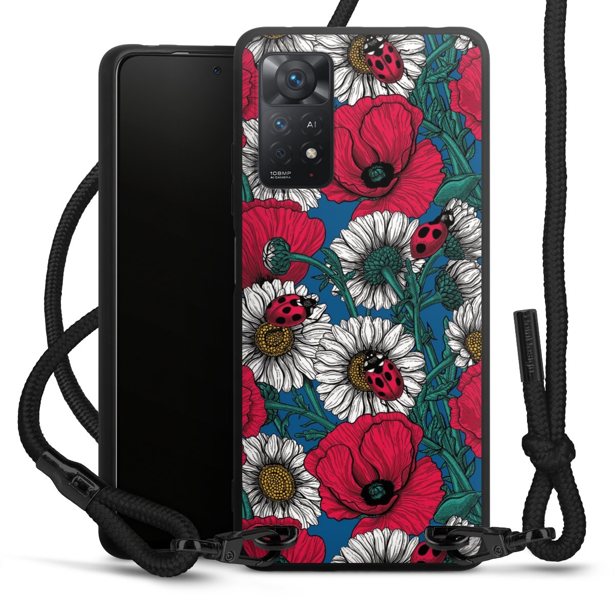 The matt black silicone case is made of flexible TPU (thermoplastic polyurethane) and offers robust protection. The durable, unbreakable material makes the cover flexible and dimensionally stable at the same time. The matte surface makes your design stand out more and is less susceptible to fingerprints and dirt. The stylish trend accessory fits comfortably in the hand and is perfectly complemented by the fabric (polyester) mobile phone strap. The braided fabric strap is approx. 1.70 metres long with a diameter of approx. 0.5 cm. Due to the special knotting technique, the length of the strap can be adjusted by simply pulling it, so that you can adapt it individually to your wishes. The practical case to wear around your neck is available with the fabric strap in black. As a little icing on the cake, we have provided the strap with a chic metal fastener in matt black. The strap is securely fastened to the case with loops made of high-quality genuine leather and press studs. The ends of the fabric strap are covered with metallic end caps and thus protected from fraying.